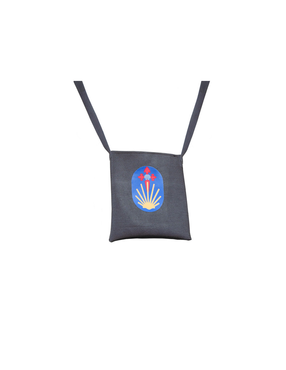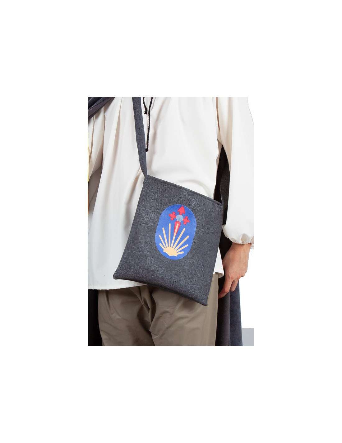 Contiene un bolso de polipiel en color gris oscuro y una imagen estampada de la cruz y concha de Santiago.