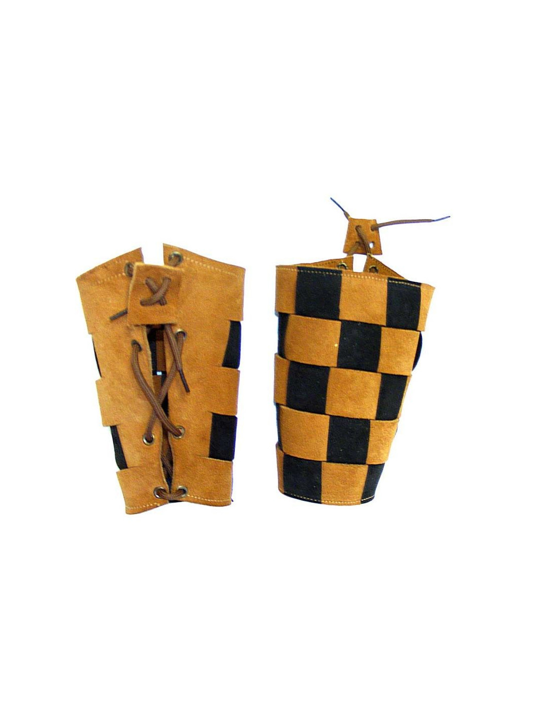 Brazaletes medievales de cuero de gran calidad en color marrón con cuadros negros y cordón en la parte trasera para ajustar perfectamente al tamaño del antebrazo.