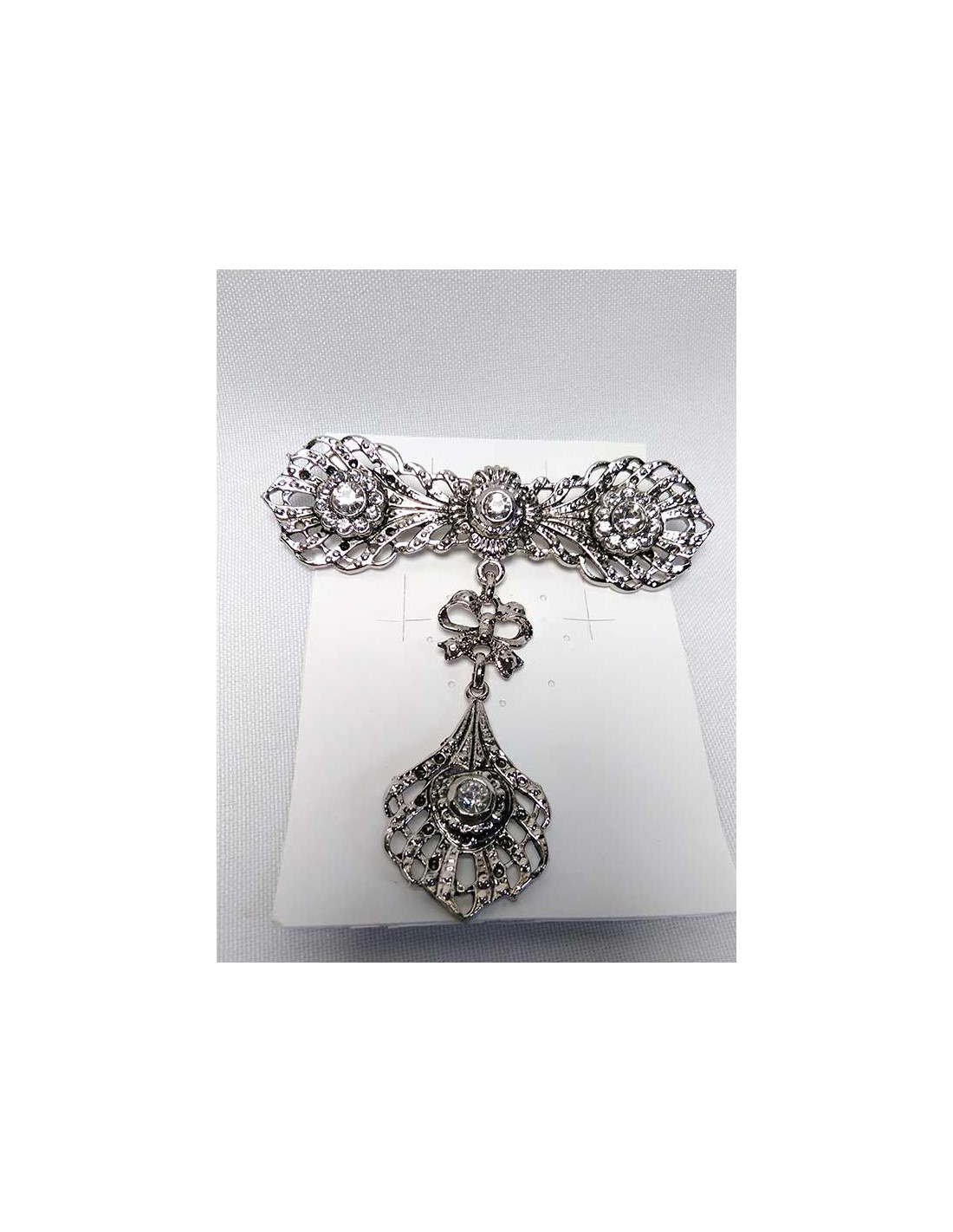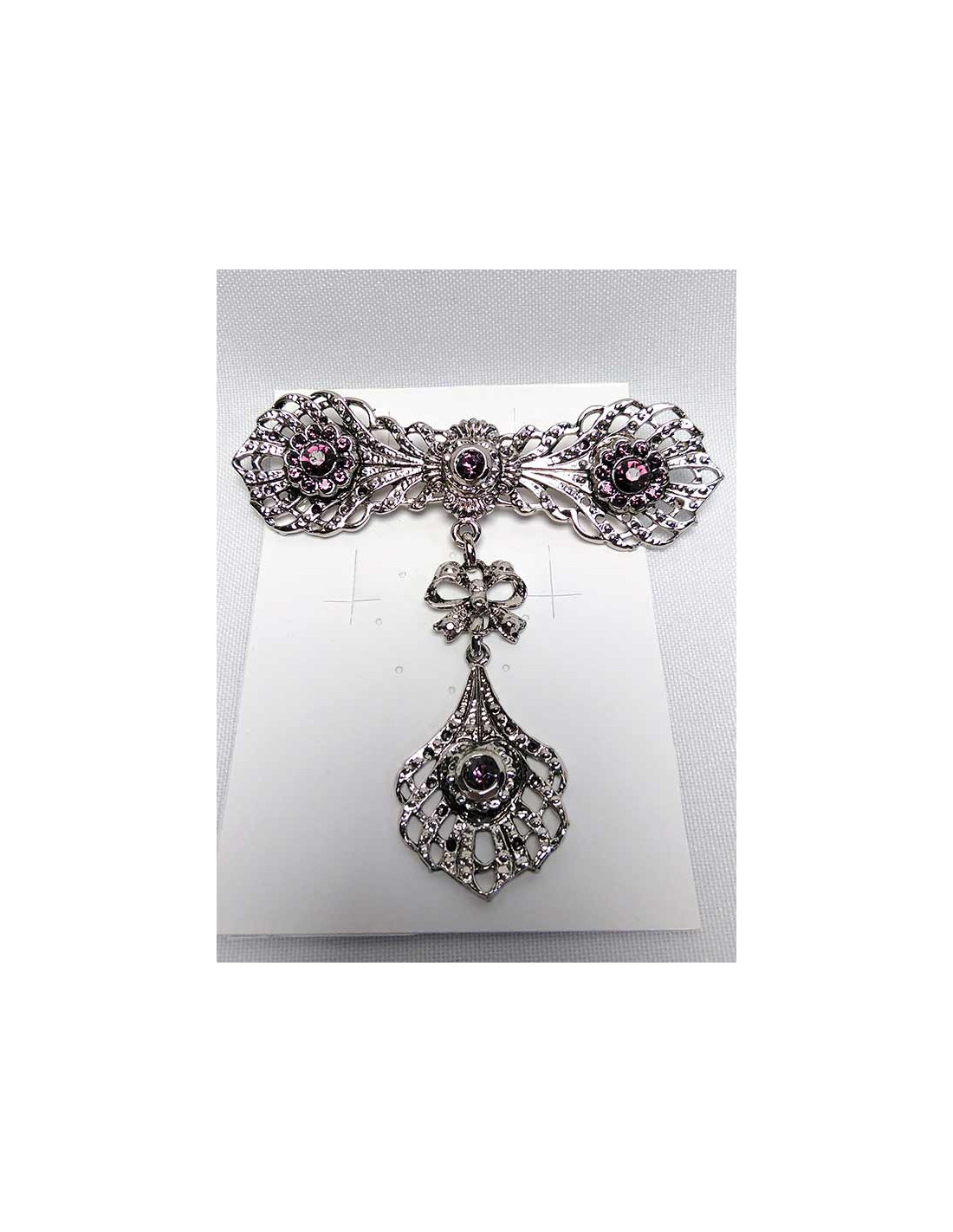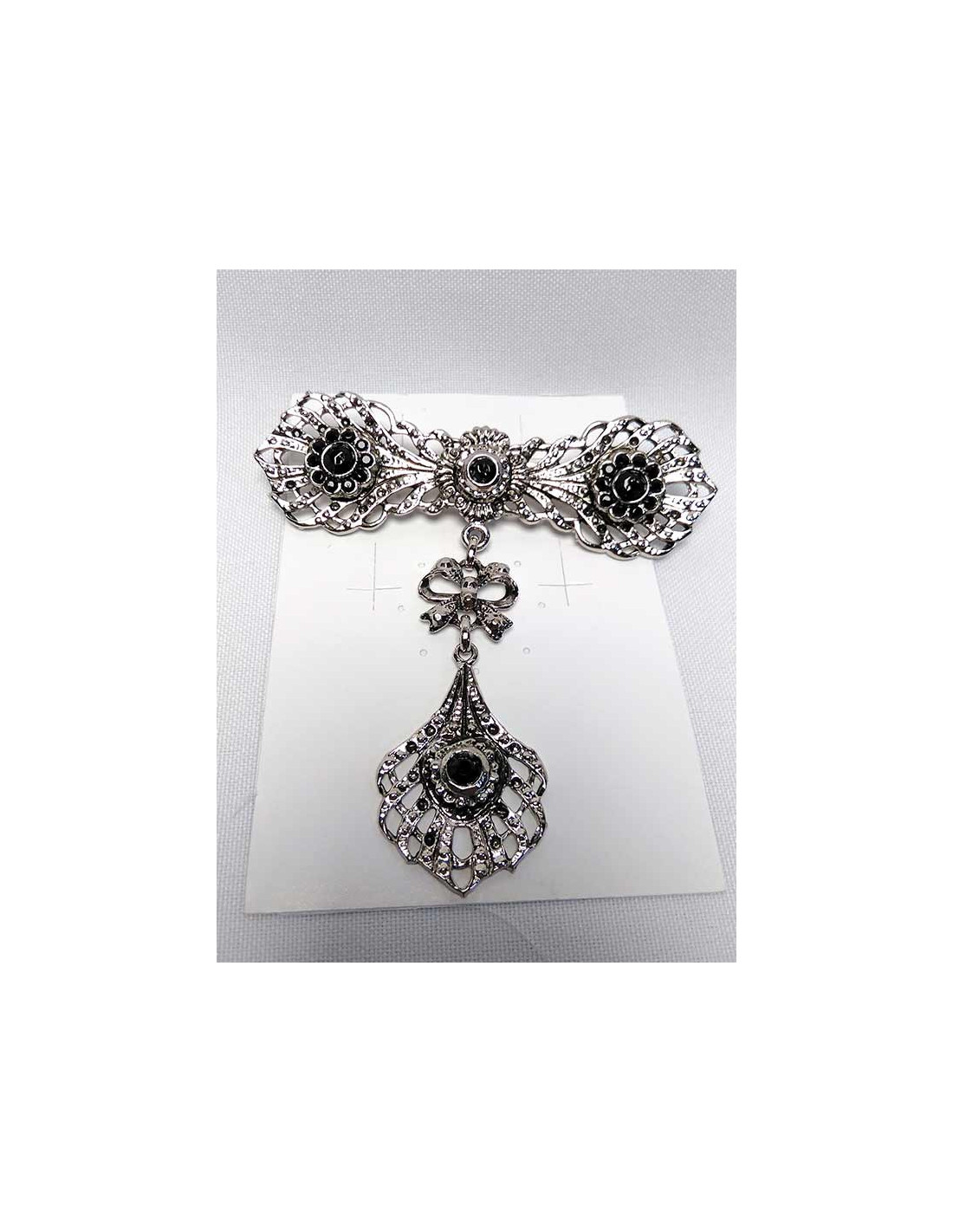 Broche para traje regional en color plata envejecida y decorado con piedras de colores.