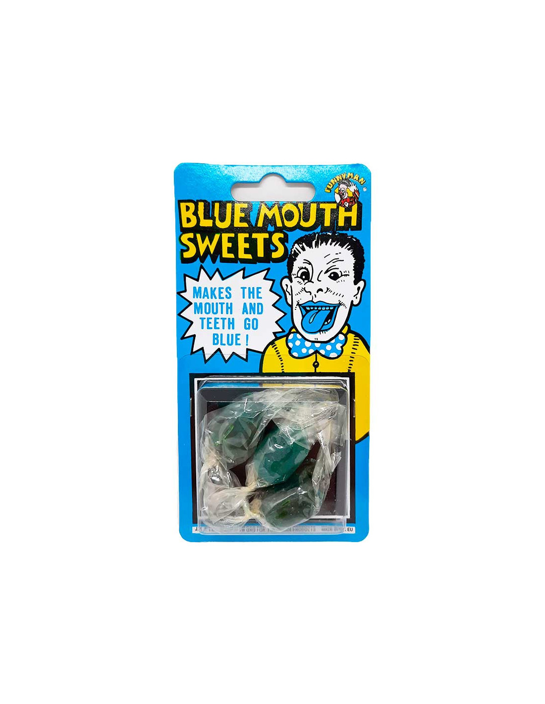 Broma caramelos azules que inluye un paquete con 3 caramelos sabor cítrico que te pondrán toda la boca de color azul.