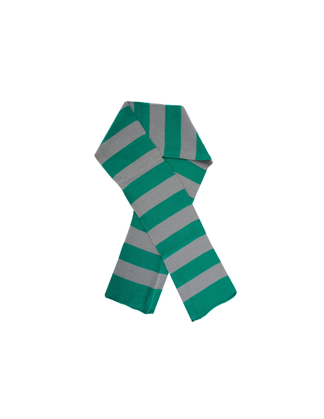 Contiene una bufanda de color gris y verde a rayas. Tiene un tamaño de 185x18 cm y es elástica.
