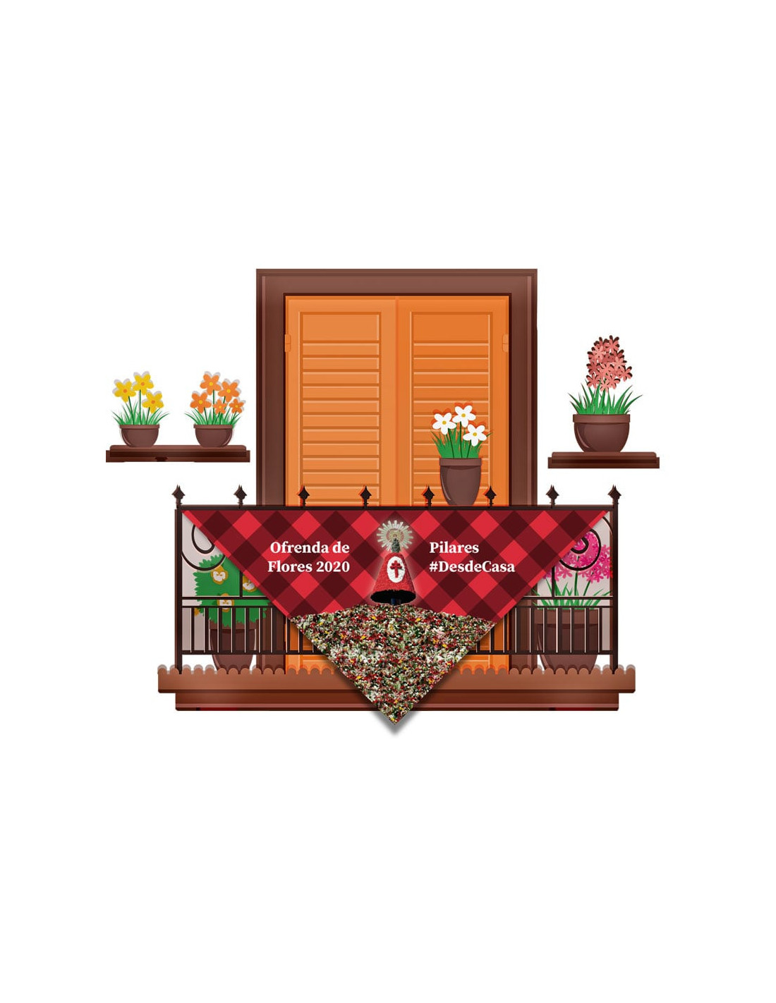 Celebra estas singulares fiestas desde casa con este cachirulo para balcones Ofrenda del Pilar. El 12 de octubre se celebra uno de los actos más emotivos y memorables de las fiestas, este año no podrá celebrarse pero desde casa y de forma responsable podemos comprar un ramo de flores, colgar nuestro cachirulo en el balcón con la vírgen y saber que el año que viene volveremos con más fuerza.