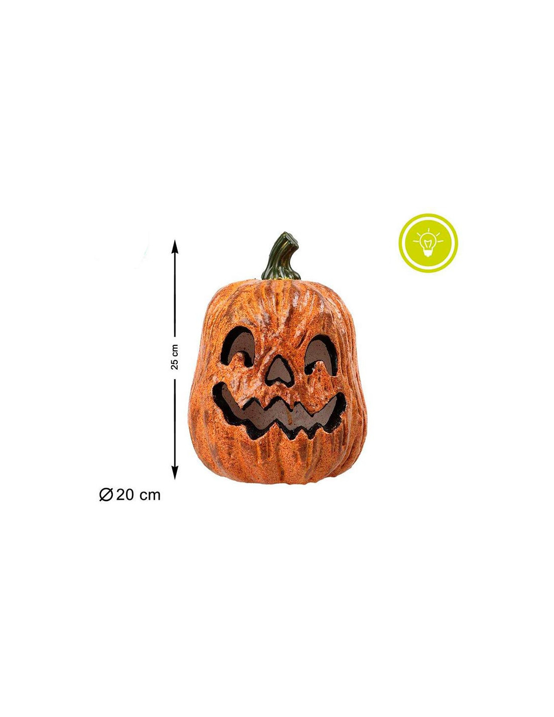 Calabaza decorativa con luz que mide 20cm de diámetro y 25cm de altura aproximadamente.