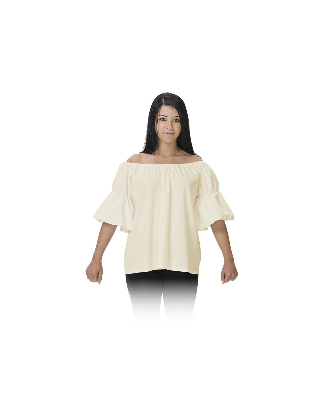 Blusa medieval con cuello barco, elástico y mangas cortas con volante muy práctica para estar en los puestos de mercados medievales. 100% polyester.