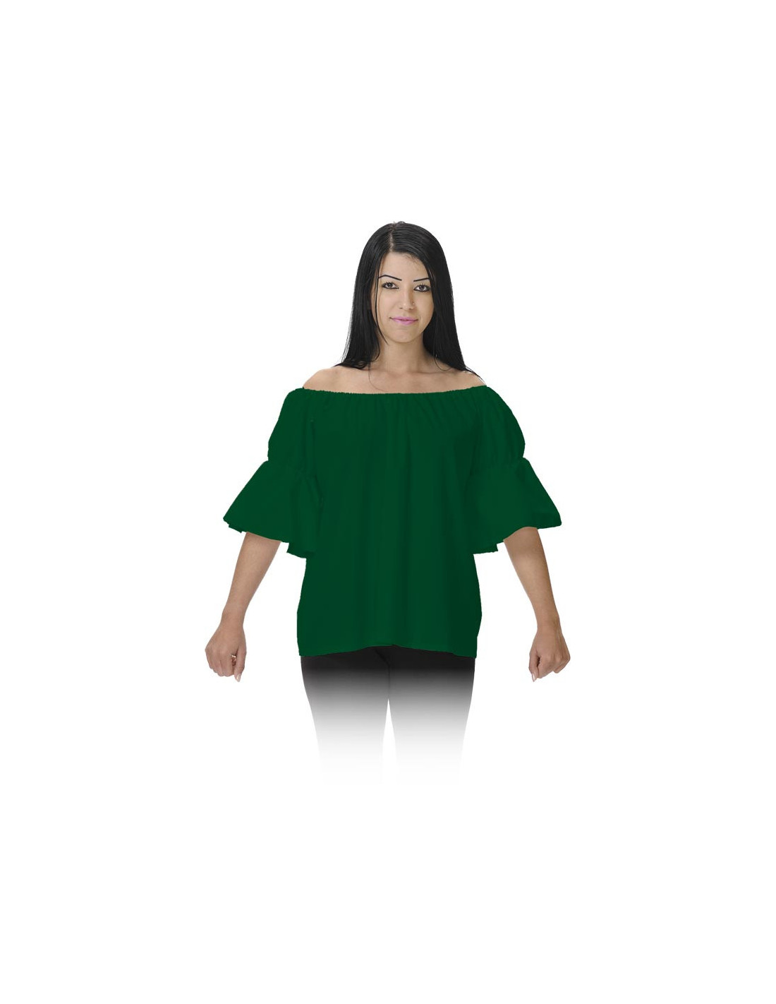 Blusa medieval con cuello barco, elástico y mangas cortas con volante muy práctica para estar en los puestos de mercados medievales. 100% polyester.