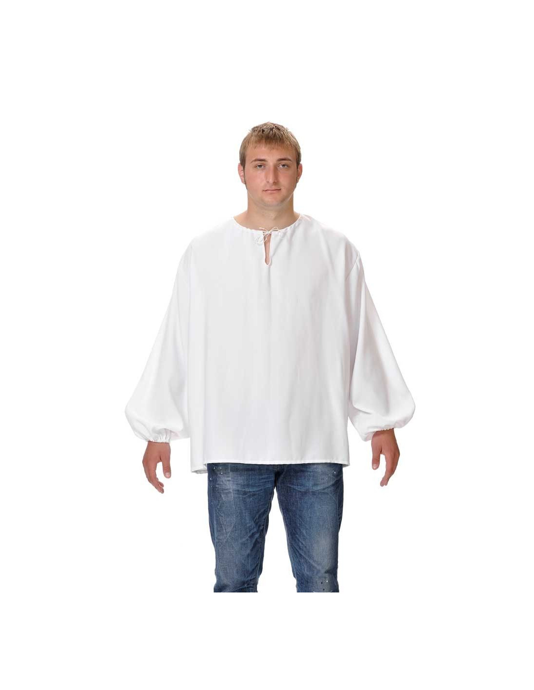 Camisa medieval de mesonero para adulto, fabricada en tela de stretch blanco, con mangas anchas y una abertura en la parte del cuello para ajustarla perfectamente a través de un cordón.