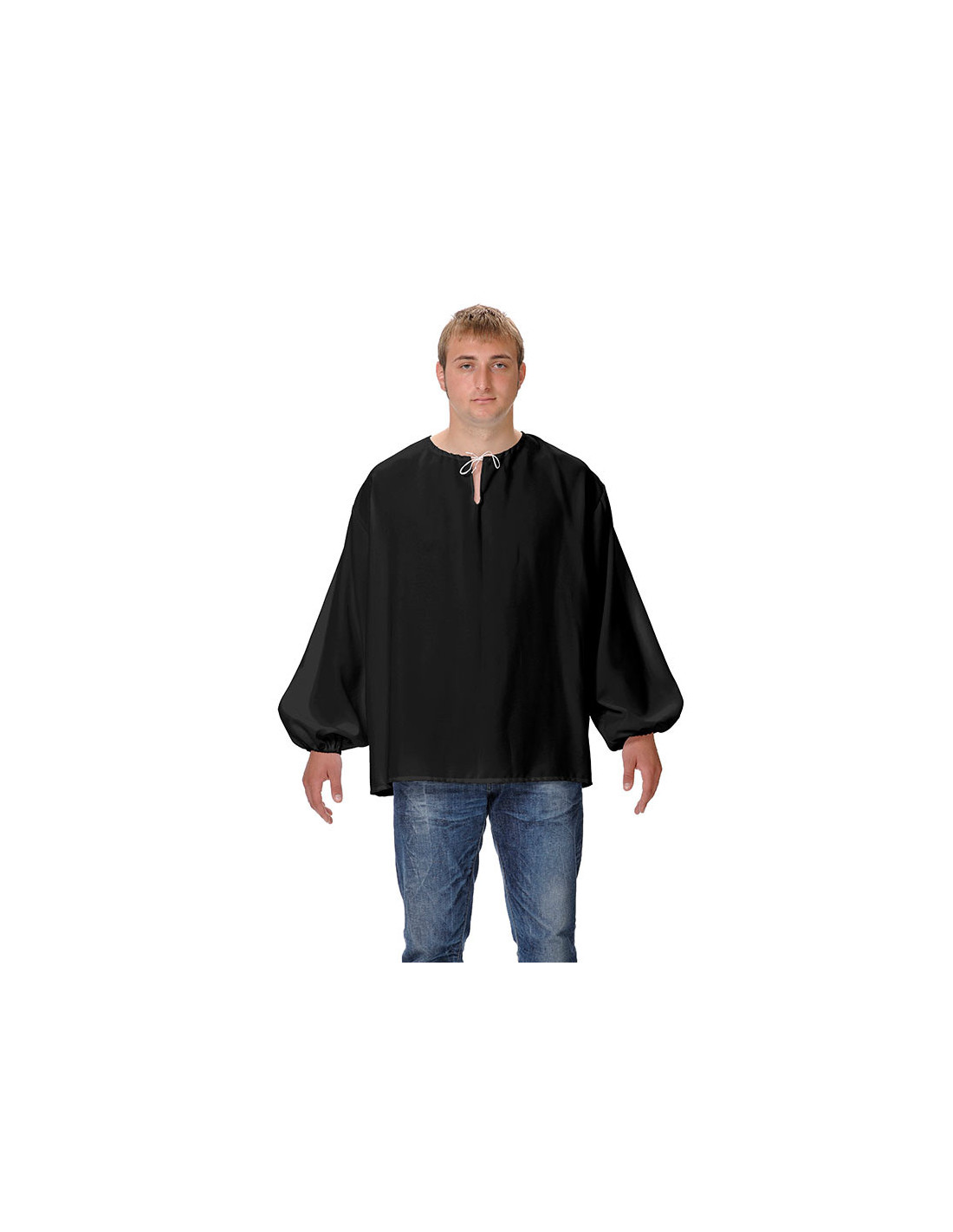Camisa medieval de mesonero para adulto, fabricada en tela de stretch blanco, con mangas anchas y una abertura en la parte del cuello para ajustarla perfectamente a través de un cordón.