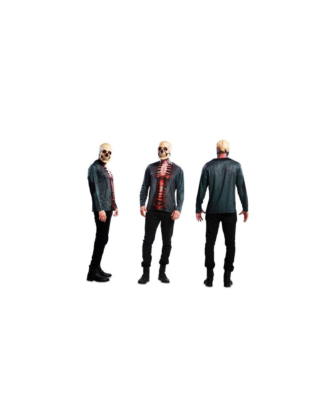 Realista camiseta de esqueleto sangriento que contiene una camiseta que simula una americana gris dejando al descubierto la parte central en carne viva con todos los huesos de la columna vertebral ensangrentados. Tallaje para adultos.