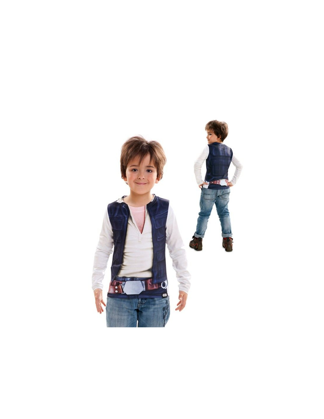 Incluye una camiseta Han Solo para niño, totalmente hiperrealista que simula la vestimenta típica del personaje, con bolsillos en la parte posterior y un chaleco ficticio sobre la misma.