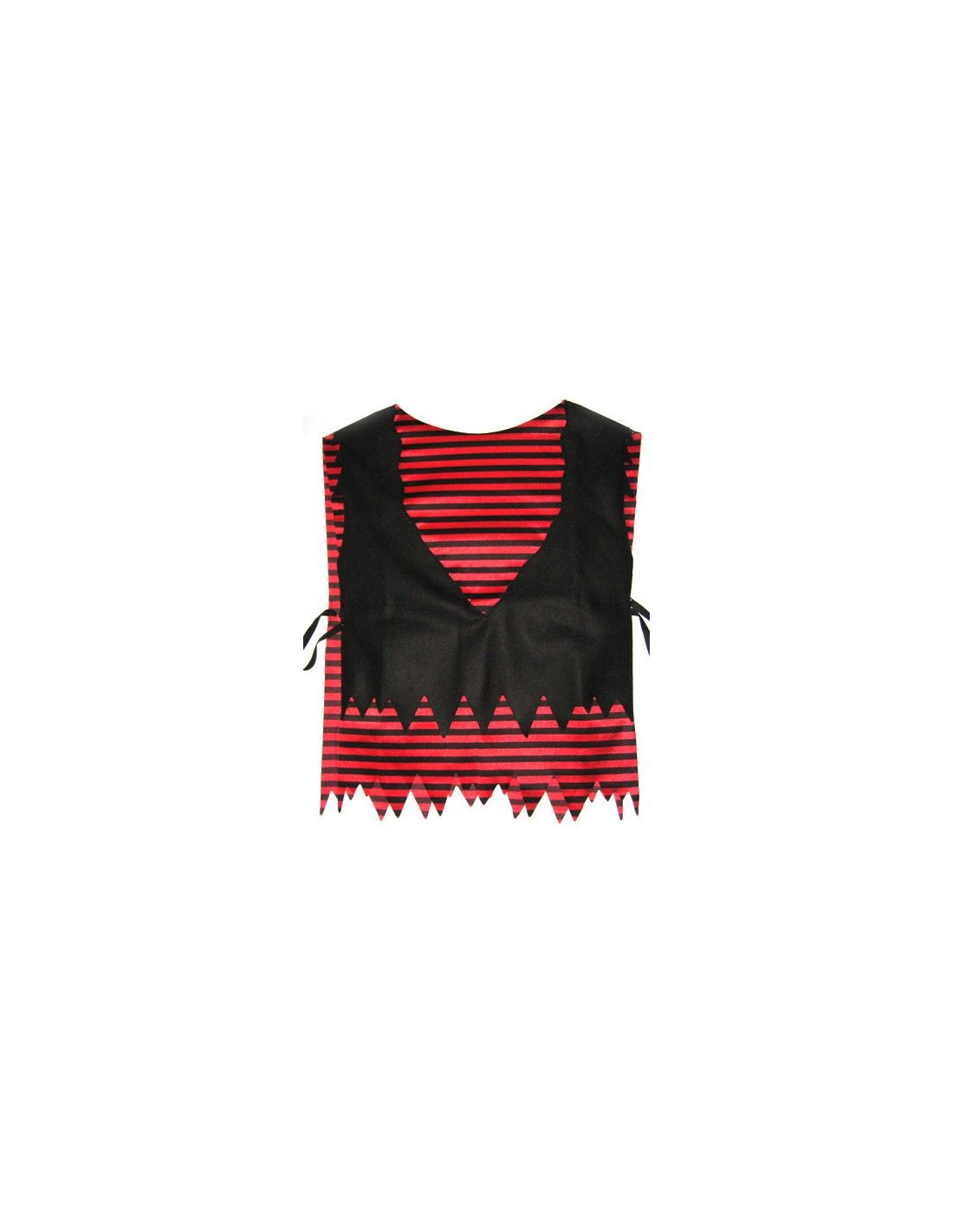Camiseta pirata con chaleco disponible en tamaño para adulto e infantil. Incluye una camiseta roja con rayas negras y rematada en picos por la parte inferior, y un chaleco negro por encima unido a la misma.