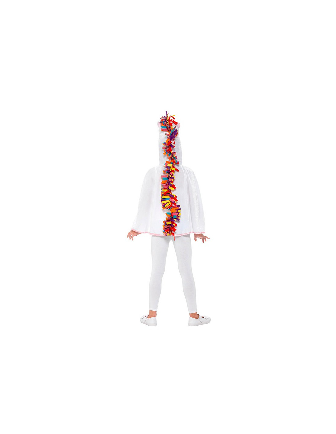 Viaja a un mundo de fantasía con esta capa de unicornio. Perfecta para las jóvenes amantes de los unicornios y la fantasia. La capucha simula la cabeza de un unicornio con cuerno acolchado y un enorme cabello multicolor.