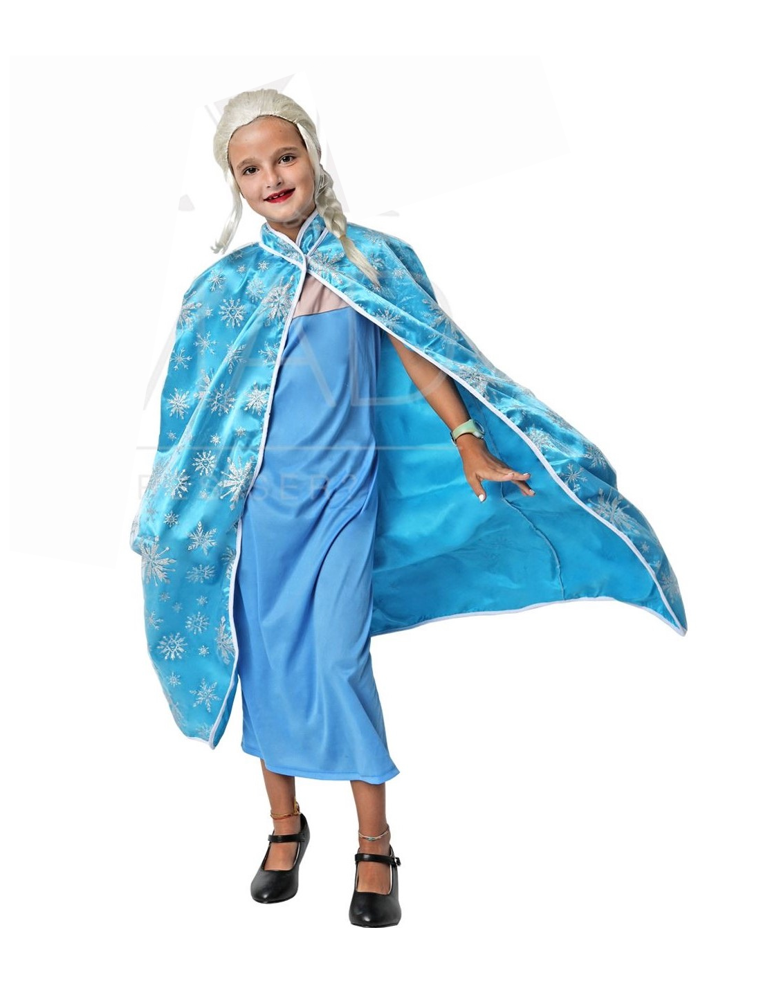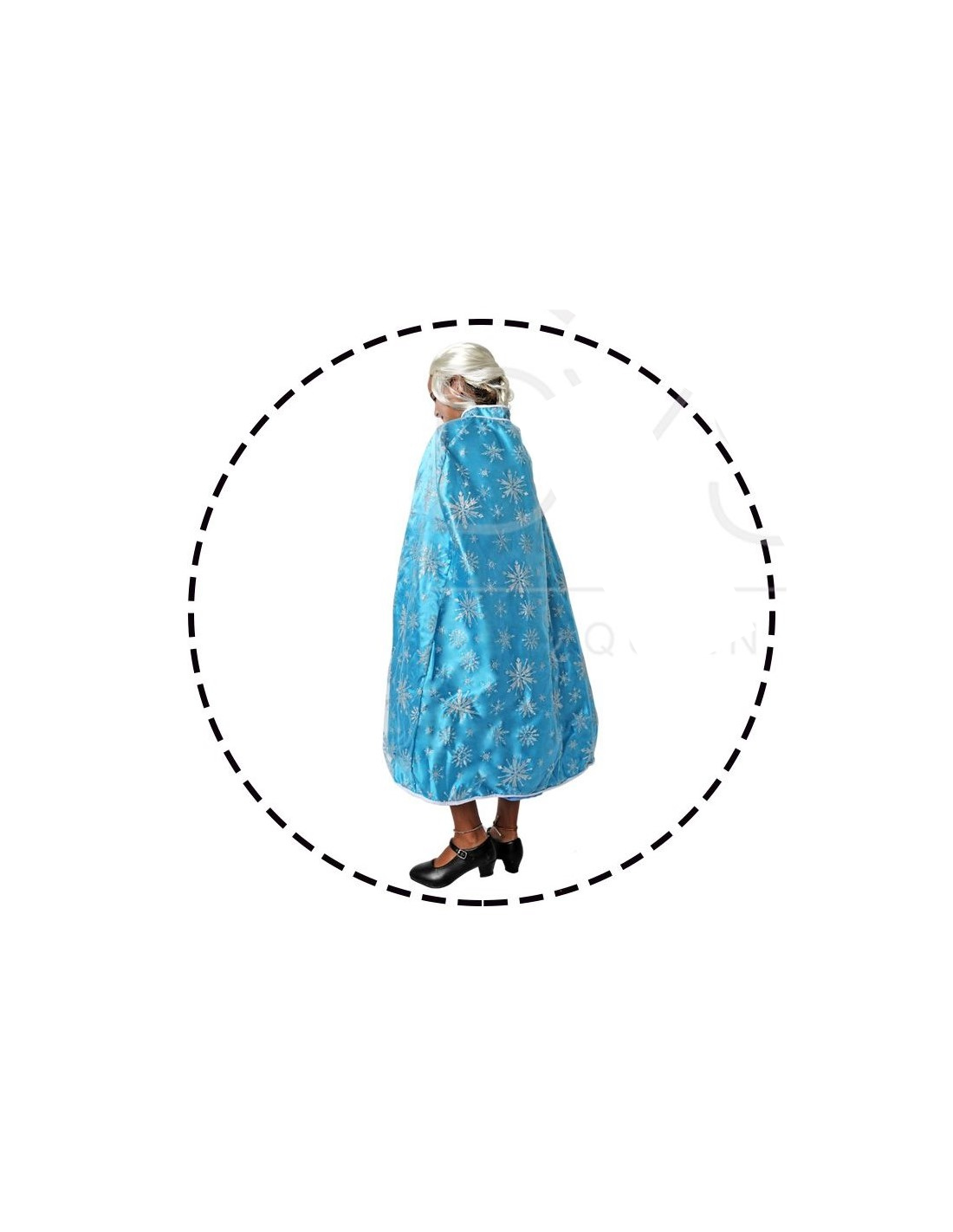 Con esta capa te transformarás en una auténtica princesa de hielo. De raso azul con estampado de copos de nieve, será el toque final para tu look de Elsa de Frozen.