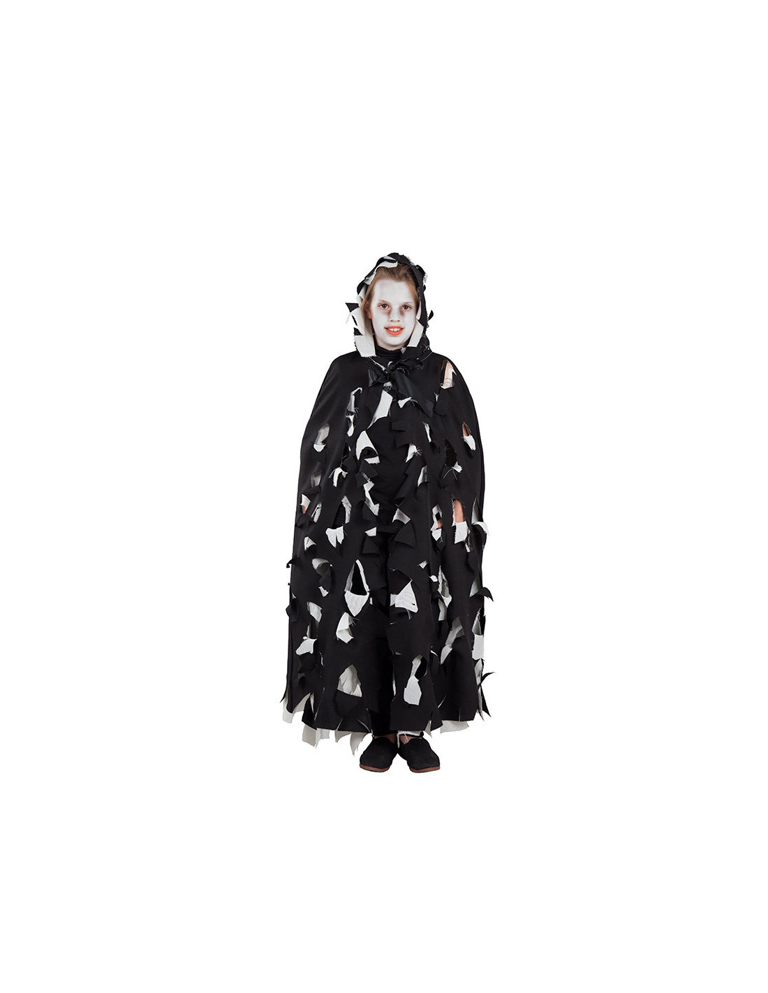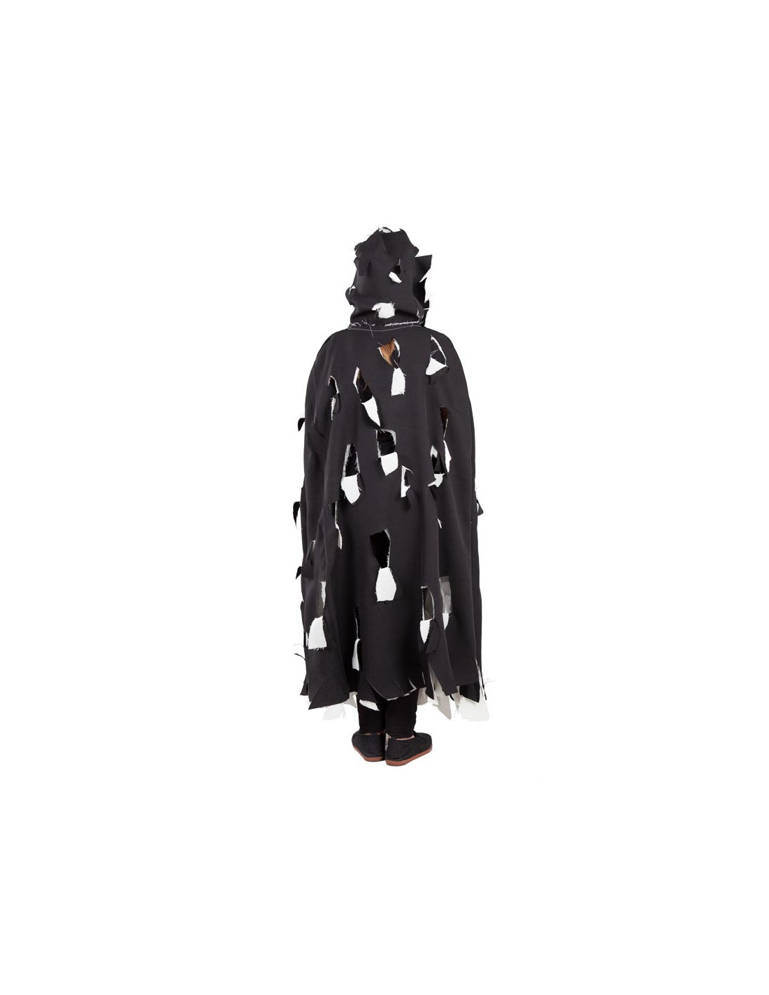 Contiene una capa con capucha de color negro con rotos.