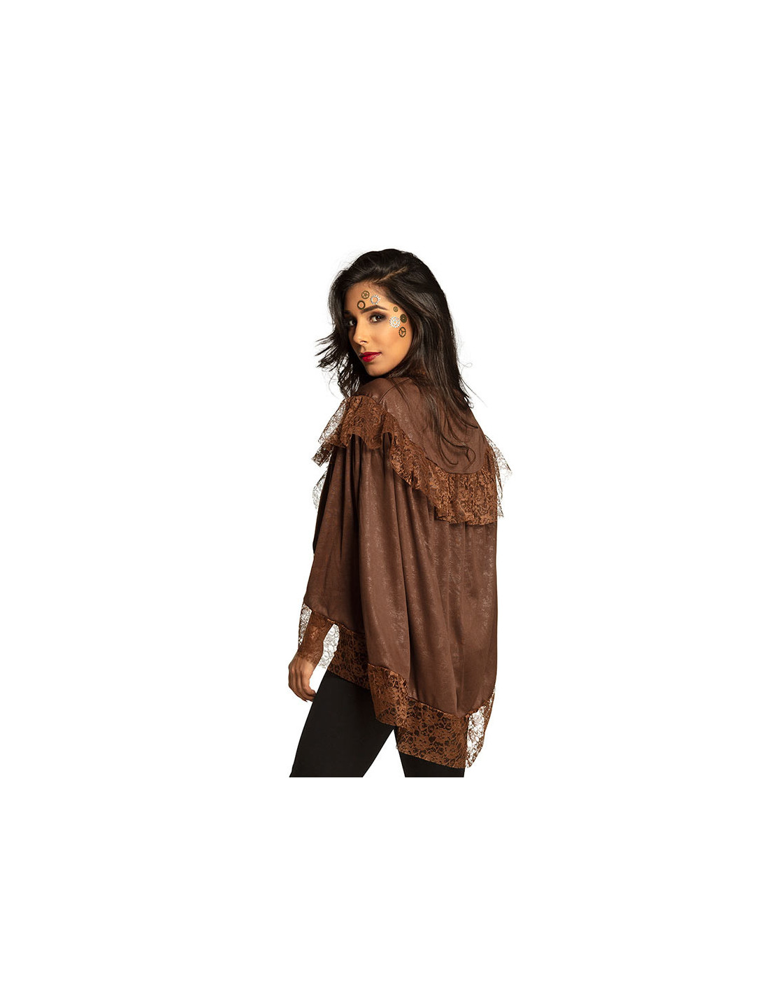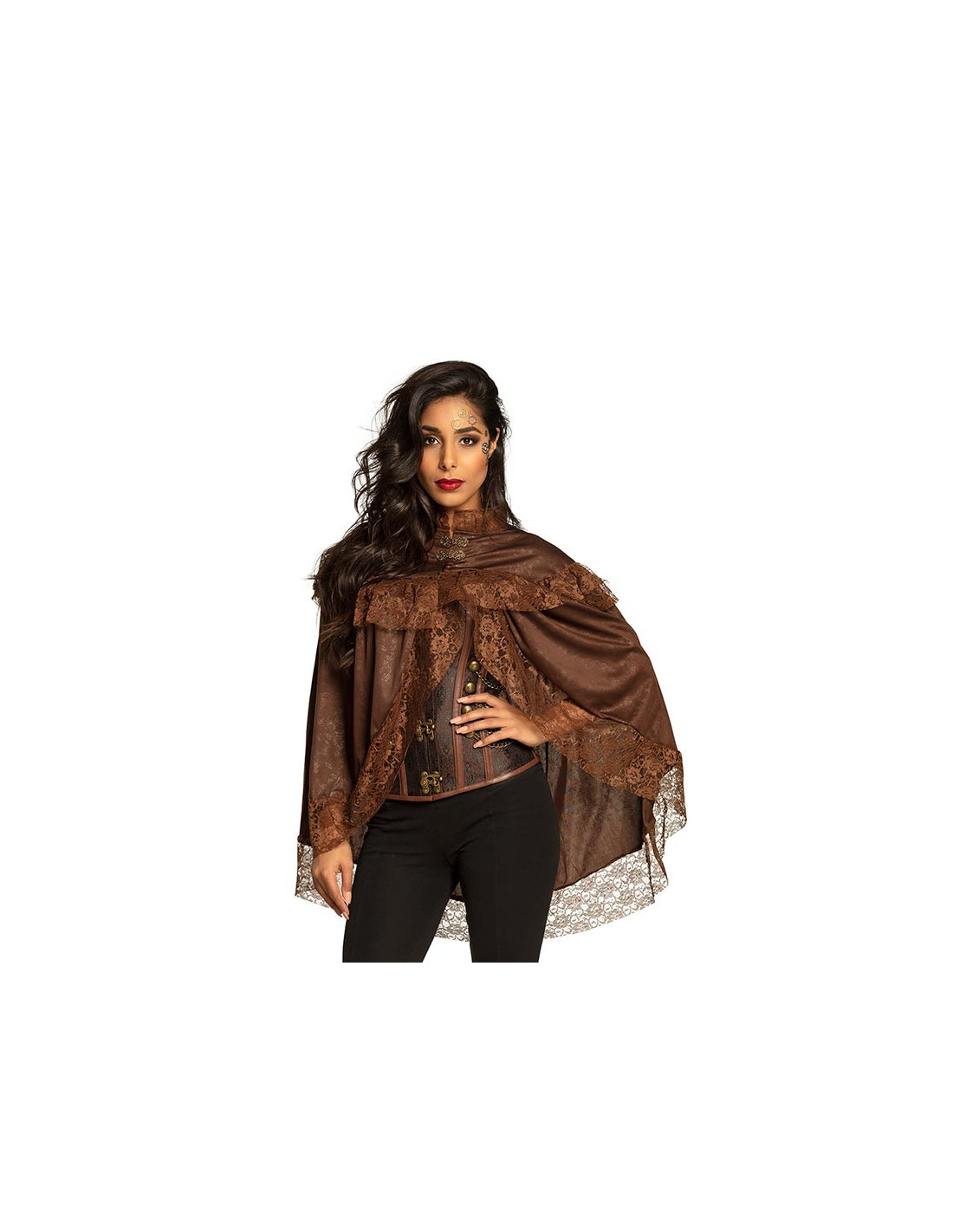 Esta capa corta Steampunk es de color marrón con acabados en puntilla.