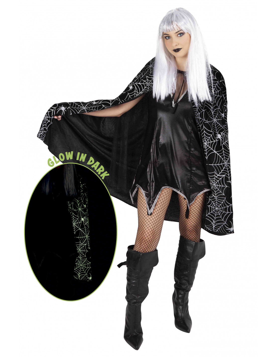 Original capa telaraña que brilla en la oscuridad para compañar tu disfraz de Halloween. Es una capa muy versátil que sirve para acompañar tanto tu disfraz de vampira, bruja o muchos otros.