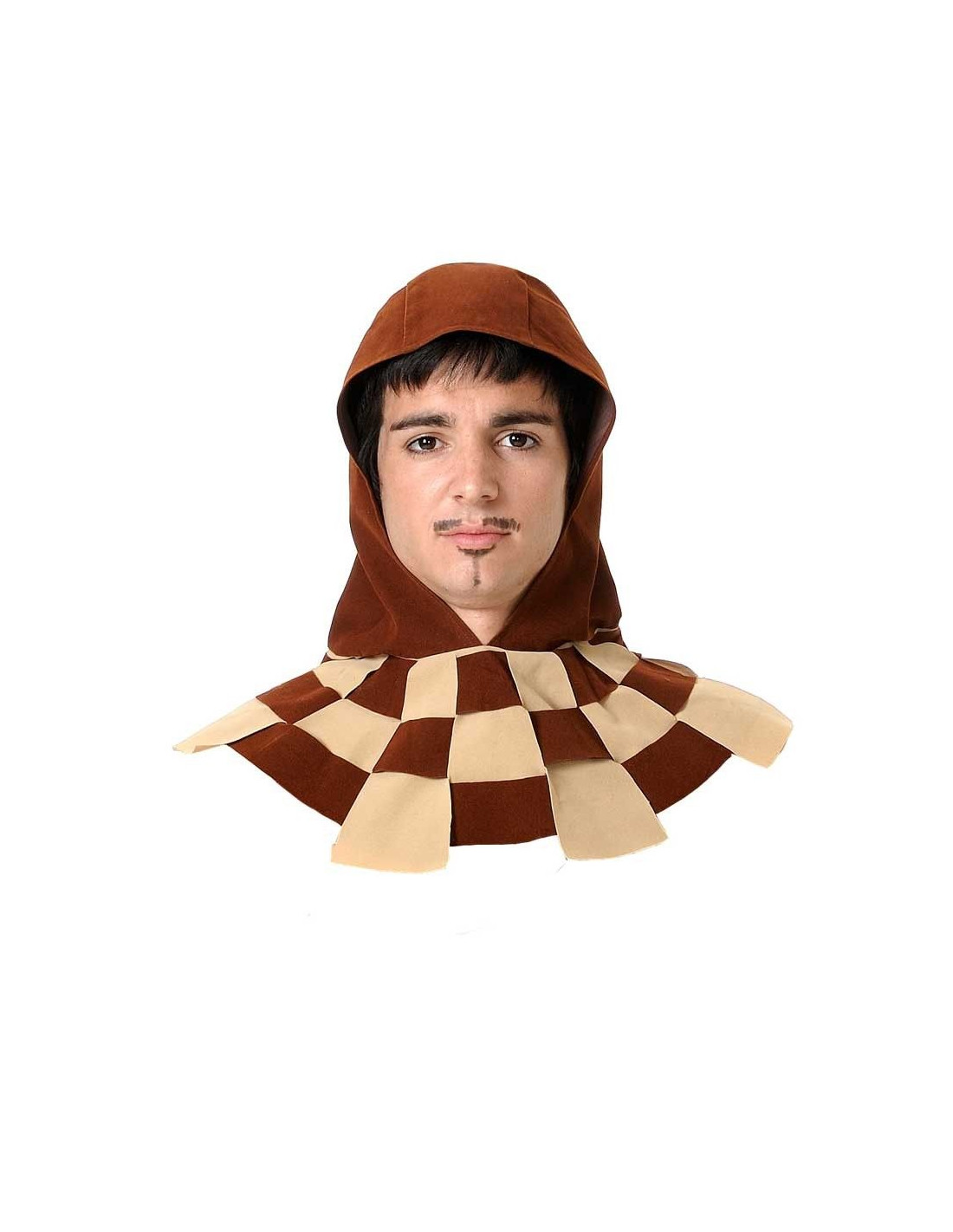 Capucha medieval marrón con cubrehombros ajedrezado a juego en tonos beige y marrón formando. Fabricado en tejido de antelina muy aprestado. Ideal para trajes de ballestero.