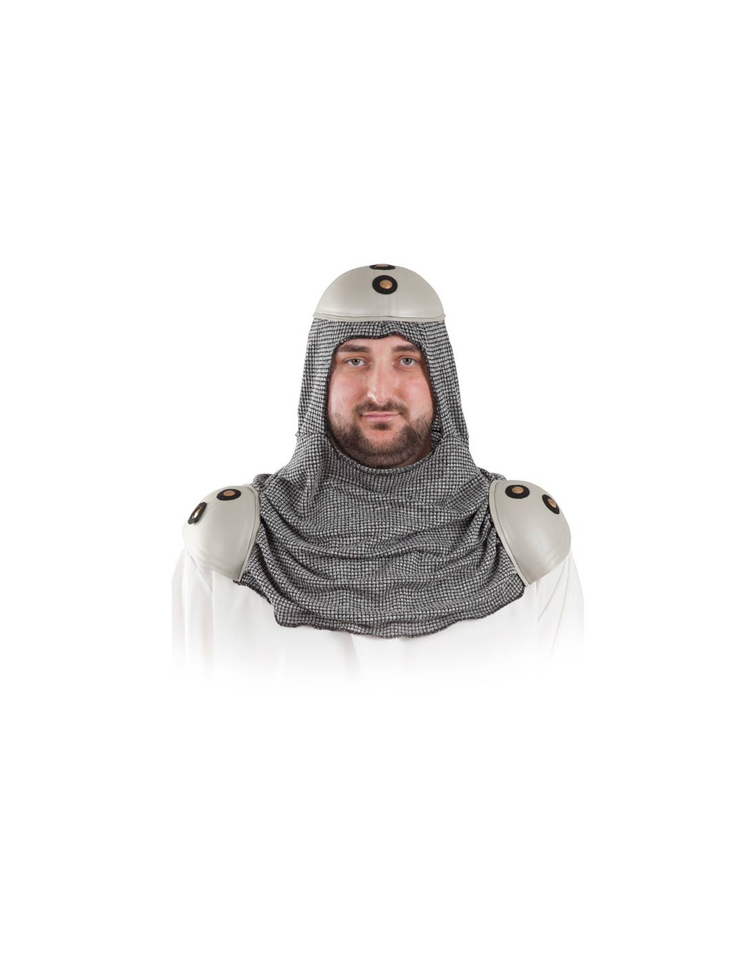 Capucha medieval para adulto de tala imitación a la cota de malla, con casco y hombreras de foam simulando una armadura y formando la parte del cubrehombros. Disponible en color gris.