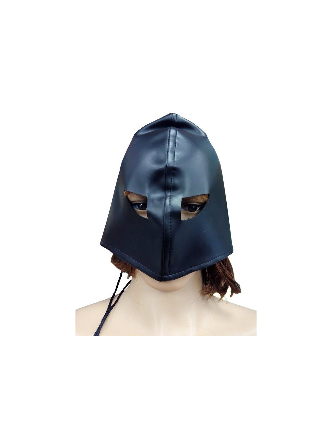 Capucha de verdugo medieval fabricada en polipiel negra que se ajusta perfectamente al tamaño de la cabeza ya que incluye un cordón en la parte trasera.