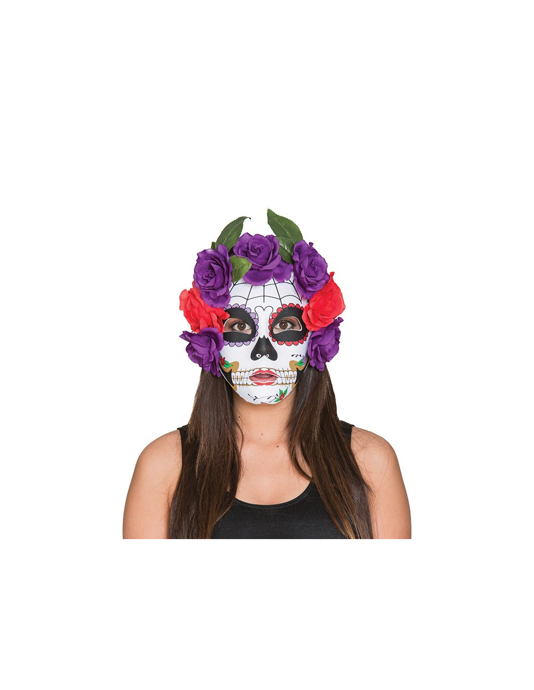 Completa tu enigmático disfraz de Catrina y oculta tu identidad con esta original careta catrina con flores de tela. Si lo tuyo no es el maquillaje, no pierdas la oportunidad de disfrazarte de calavera mejicana con esta careta.