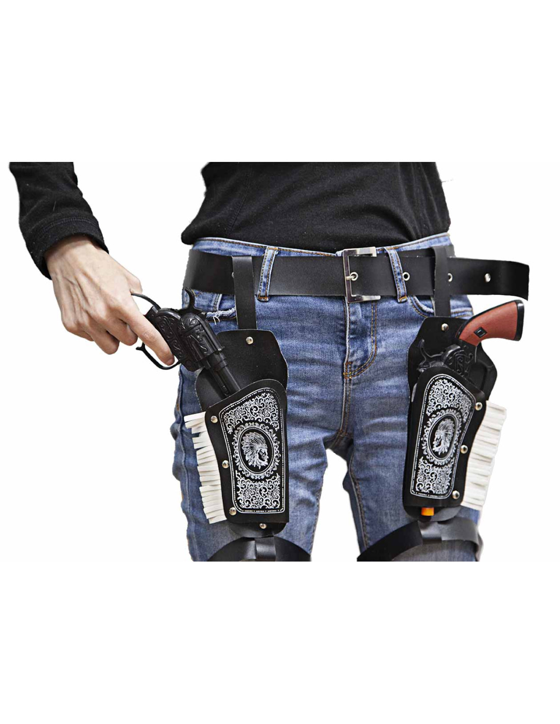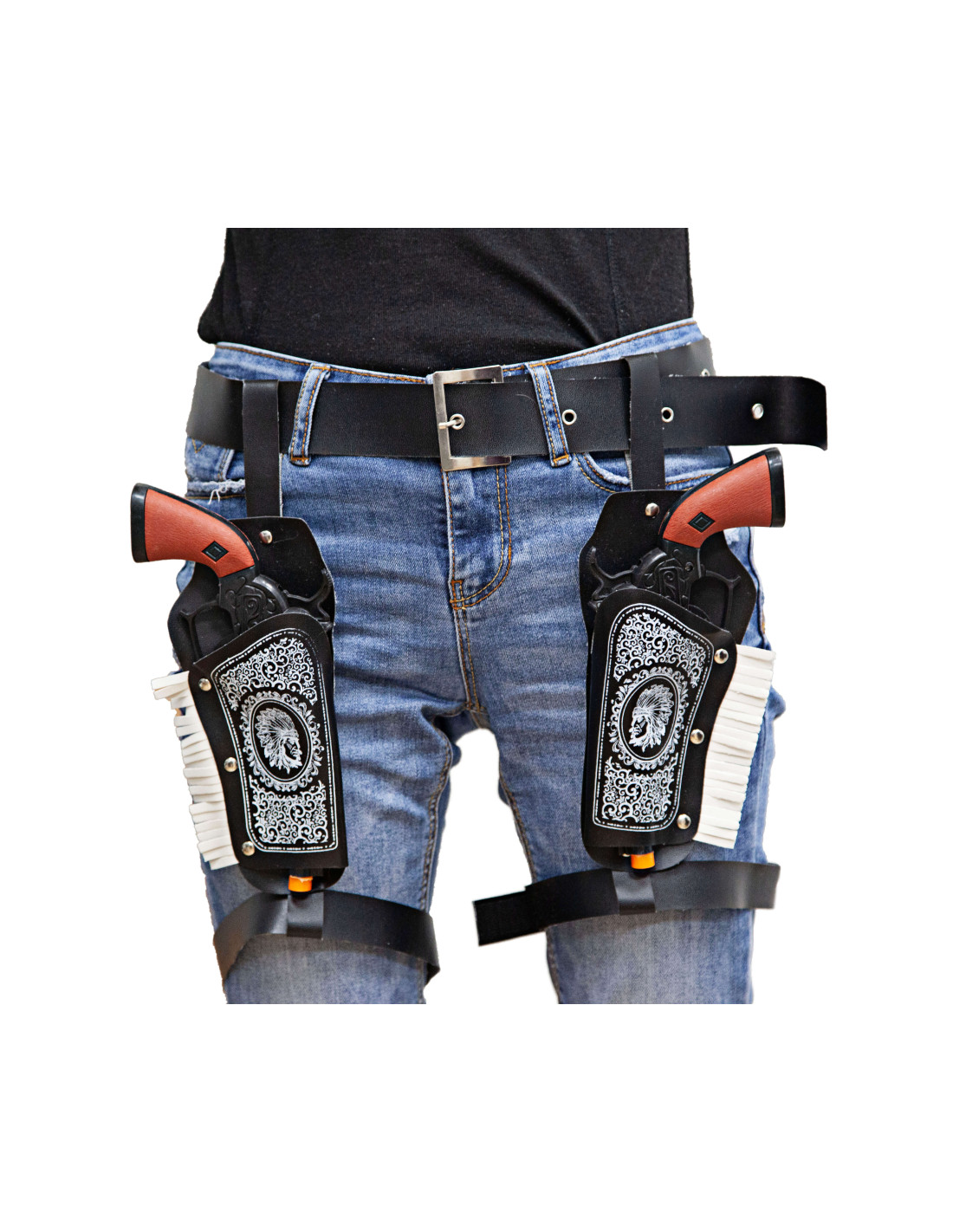Estas cartucheras vaqueras incluye dos cartucheras con dos pistolas que se ajustan a la cintura mediante un cinturón que incluye y unas cintas para cada una de las piernas.