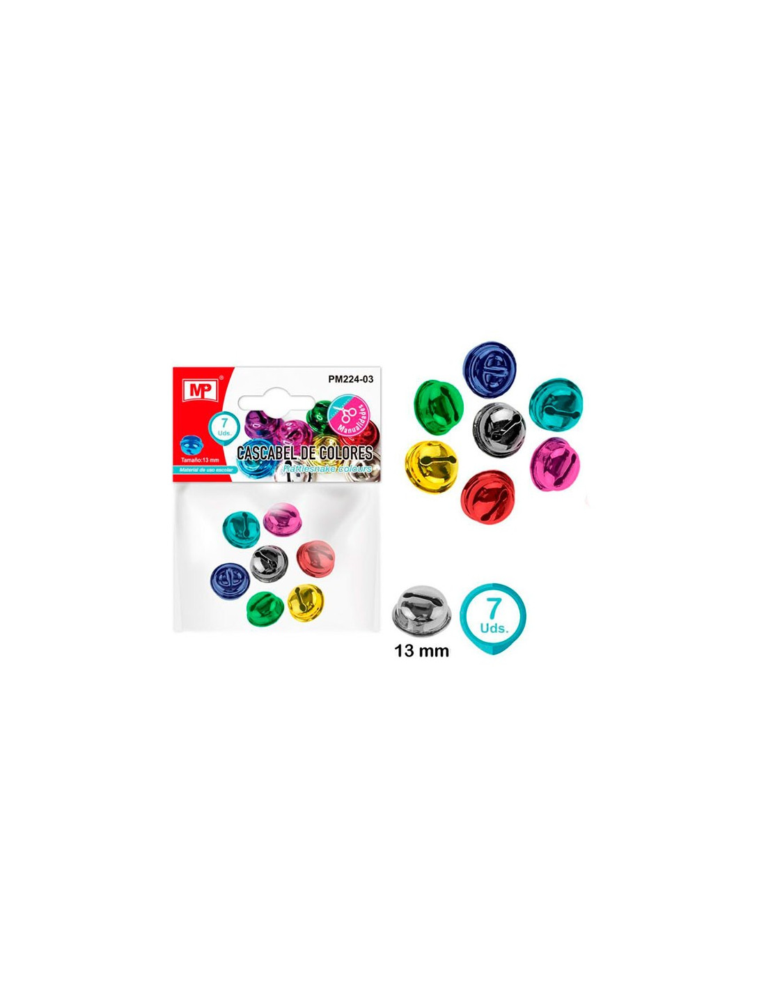 Contiene una bolsa con 7 cascabeles de distintos colores y un tamaño de 13mm.