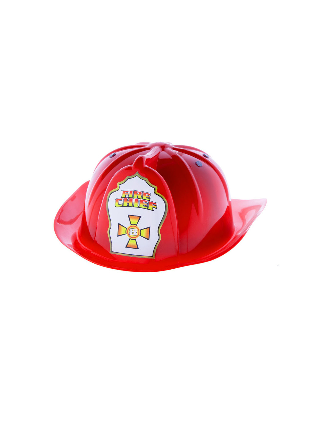 Casco de Bombero americano para niño, de color rojo, fabricado de plástico rígido y con un escudo con la frase "fire chief" (jefe de bomberos) en la parte frontal.