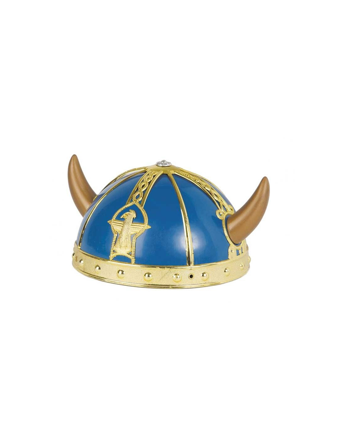 Casco vikingo con la base en color azul y decoraciones doradas, con dos pequeños cuernos en los laterales. Fabricado de plástico de pvc rígido.