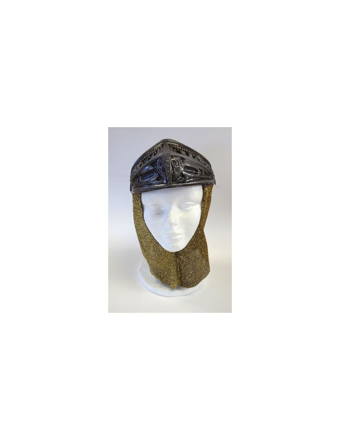 Casco medieval tipo visera con tela de malla dorada imitando a una capucha de cota de malla. Tamaño infantil. Fabricado de plástico.