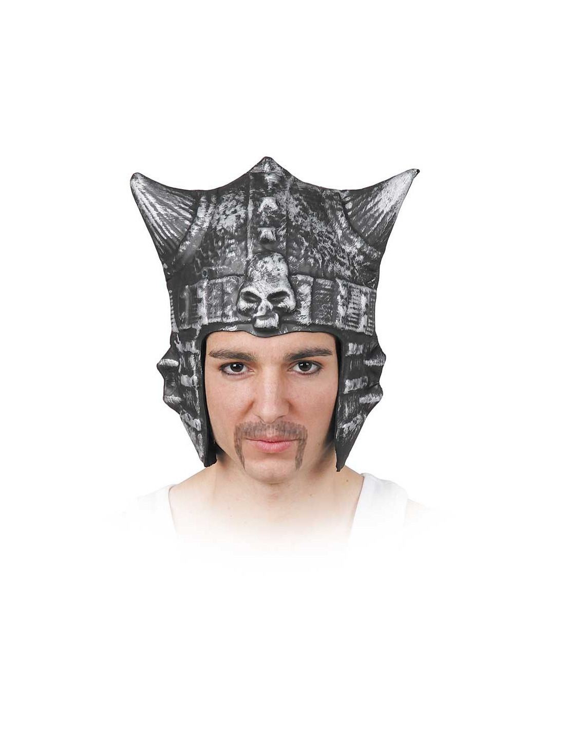 Casco de goma eva flexible color plata envejecido y rematado en tres cuernos sobre la parte superior. Cuenta con una calavera en refiere en la parte frontal. Tamaño adulto.