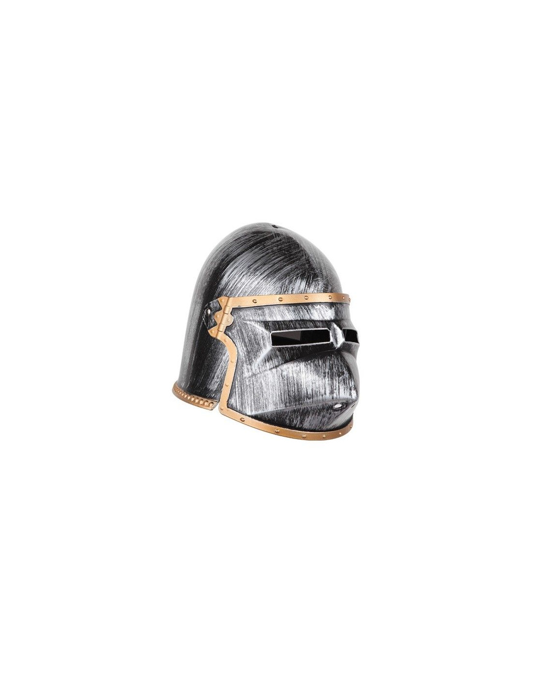 Casco medieval estilo bacinete picudo, con visor articulado y funcional en la parte frontal. Fabricado de plástico rígido, es de color plata envejecido con detalles en bronce para darle un aspecto mucho más realista. Tamaño para adulto.