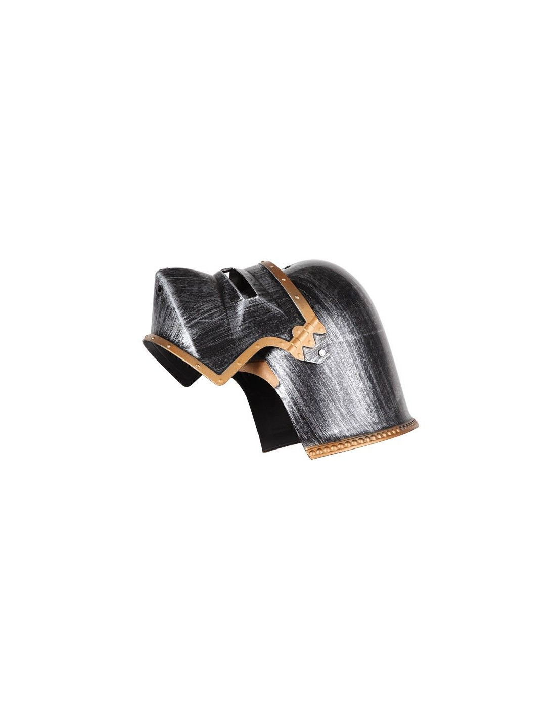 Casco medieval para tus recreaciones de batallas medievales. Fabricado en plástico de pvc, es un tipo de casco estilo a un bacinete medieval picudo, pues cuenta con la parte de la boca acabada en pico. De color plata envejecido con los detalles en bronce, cuenta con una visera funcional en la parte delantera. Tamaño para adulto.