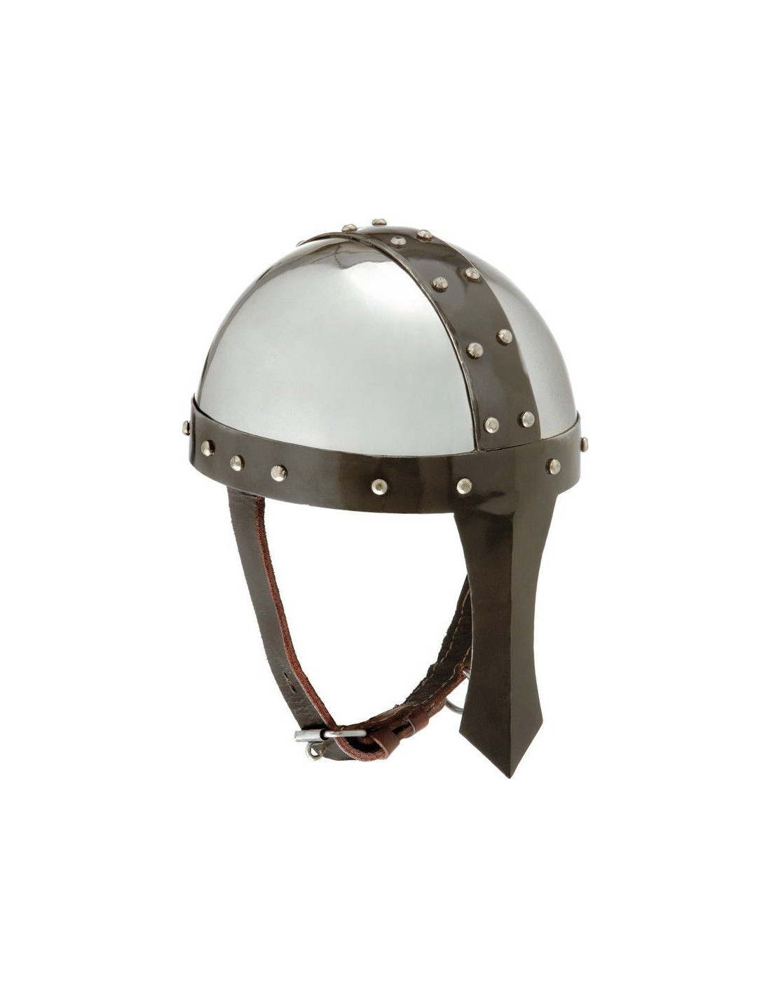 Casco medieval Spangenhelm de alta calidad. Fabricado de metal color plata, con dos tiras metálicas marrones, una sobre el perímetro y otra sobre la transversal, sujetadas con remaches visibles. Incluye correra para ajustar perfectamente al tamaño de la cabeza y protección nasal.