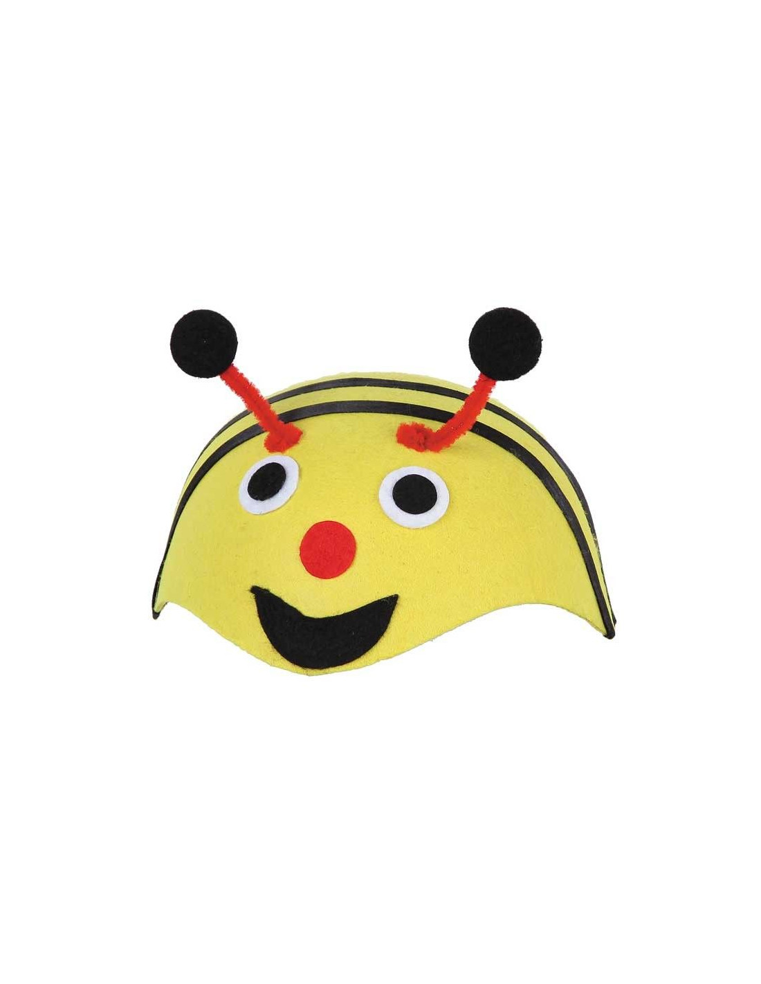 Casquete de fieltro para la cabeza y decorado con nariz, orejas, ojos y boca con trozos de fieltro pegado para caracterizar una abejita y con una gomita para sujetar