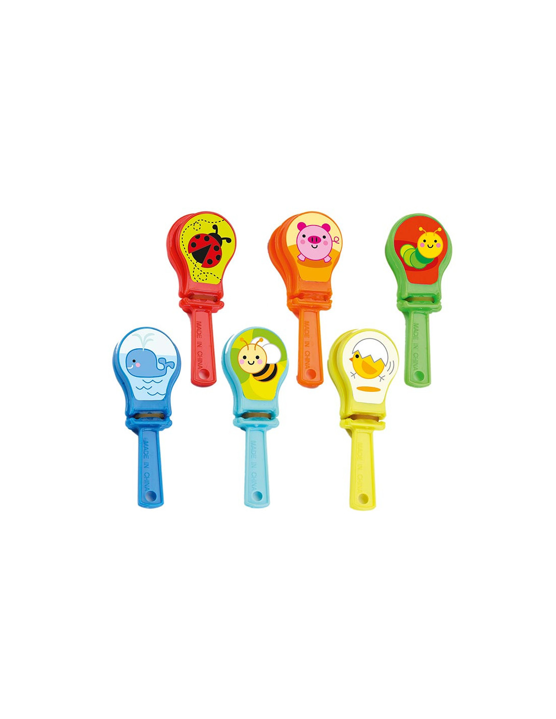 Castañuela de juguete para piñata que incluye un aplaudidor de plástico en color y modelo aleatorio. Tiene un tamaño de 7 x 2,7cm aproximadamente.