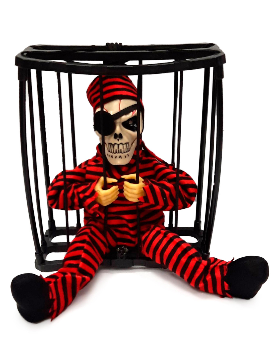 Celda de 23x10x27cm con esqueleto pirata en el interior para tu terrorífica fiesta de Halloween. Ambienta la casa con su luz, sonido y movimiento. Incluye dos cuerdas para poder colgarlo.