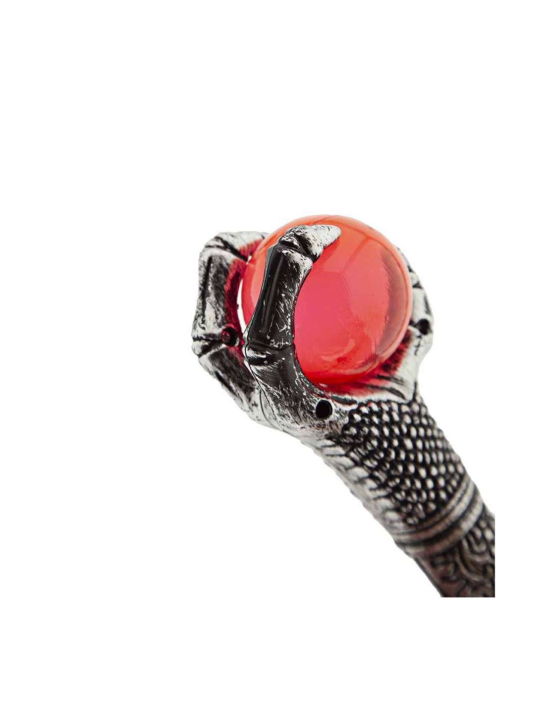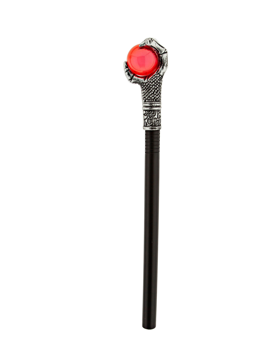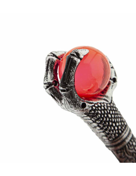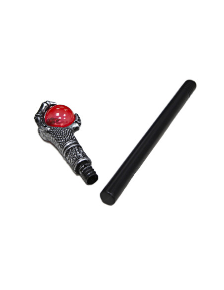 Este cetro de mago hechizado es de plástico con un aspecto envejecido y una esfera roja transparente en su empuñadura. Mide 48cm de alto y viene desmontado en dos piezas que encajan fácilmente.