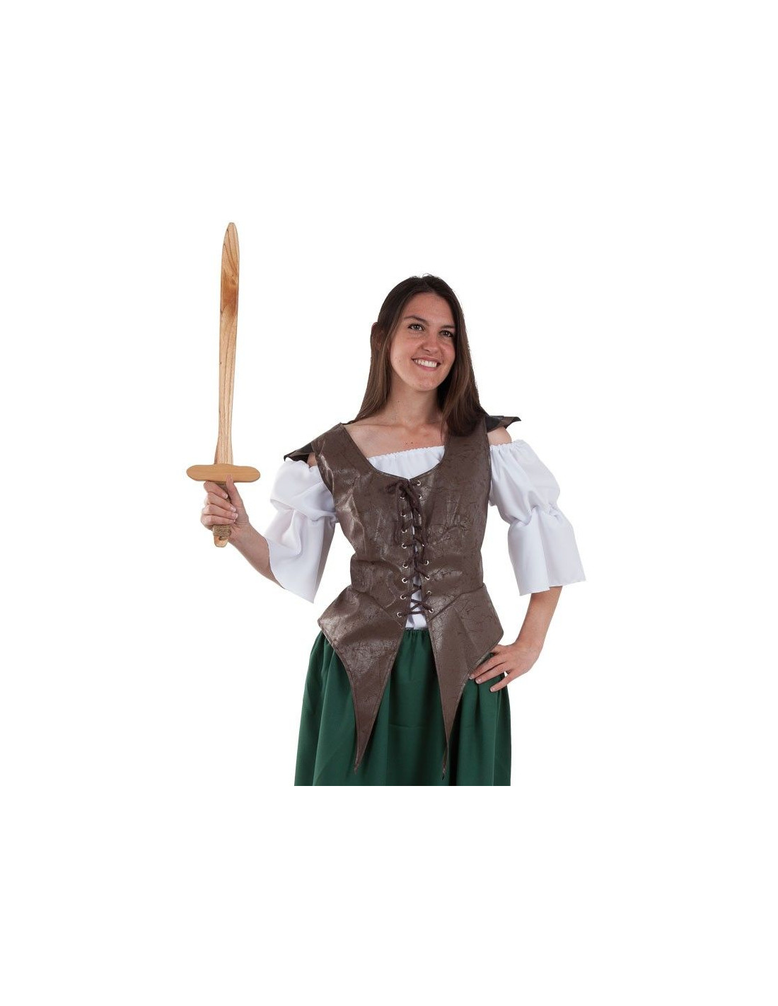 Chaleco medieval para tu disfraz de guerrera del medievo. Fabricado en polipiel marrón de aspecto envejecido, con las solapas inferiores delanteras acabadas en pico, presenta por la parte anterior un sistema para ajustar a través de cordones y ojetes.