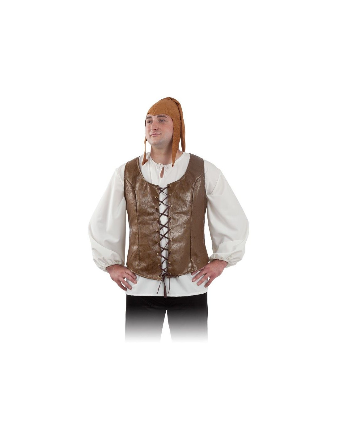 Chaleco medieval para hombre con la que serás cualquier personaje histórico de la Edad Media, desde un simple campesino hasta todo un guerrero. Fabricado en polipiel marrón de aspecto envejecido, presenta por la parte anterior un sistema para ajustar a través de cordones y ojetes.