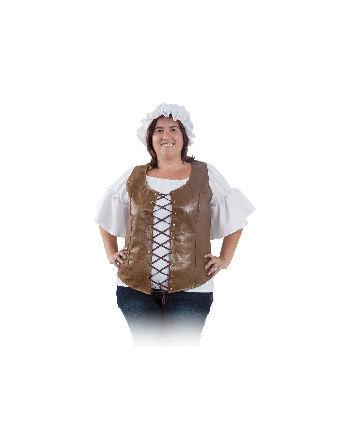 Chaleco medieval para mujer con el que podrás vivir los mejores momentos de la Edad Media. este tipod e corpiño, fabricado en polipiel de color marrón, presenta unos ojetes y cordón trenzado en la parte delanera a modo de sujección.