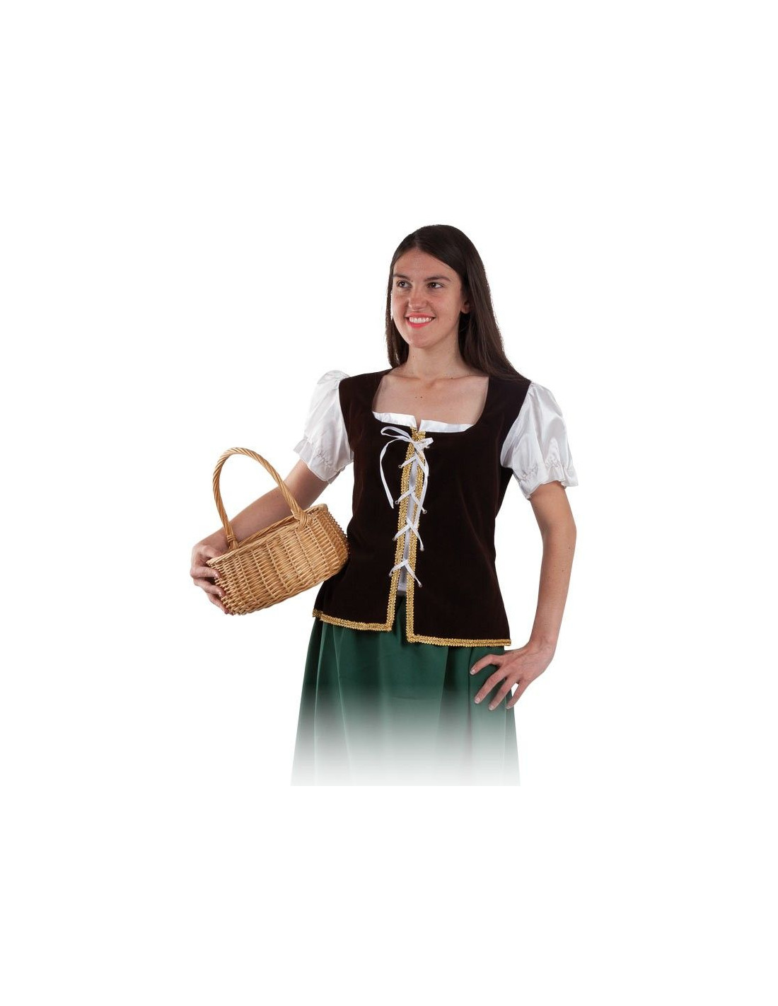 Chaleco medieval para mujer con el que podrás convertirte en toda una mesonera del medievo. Fabricado de tejido de antelina en color marrón oscuro y los bordes ribeteados en color dorado, presenta por la parte frontal la posibilidad de anudarse para ajustar perfectamente al cuerpo a través de un cordón blanco. Disponible en varios tallajes