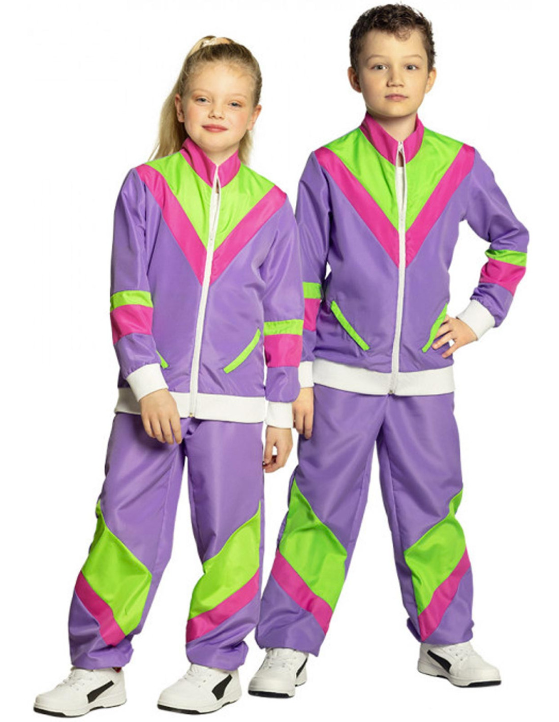 Con este disfraz viajarán a los 80 gracias a este chándal retro de color morado y detalles verdes y rosas. Toda la familia podéis viajar al pasado y convertiros en una auténtica familia ochentera.