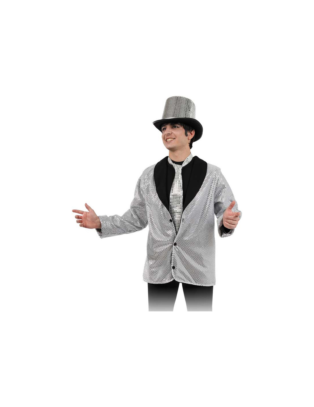 Chaqueta de lentejuela plata con solapas negras para que hagas de presentador ó animador en una fiesta. También puedes comprar otros complementos adecuados al traje como chistera, bastones pelucas etc.