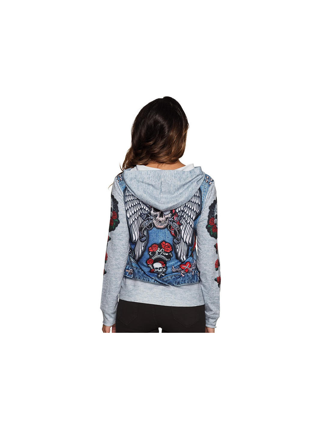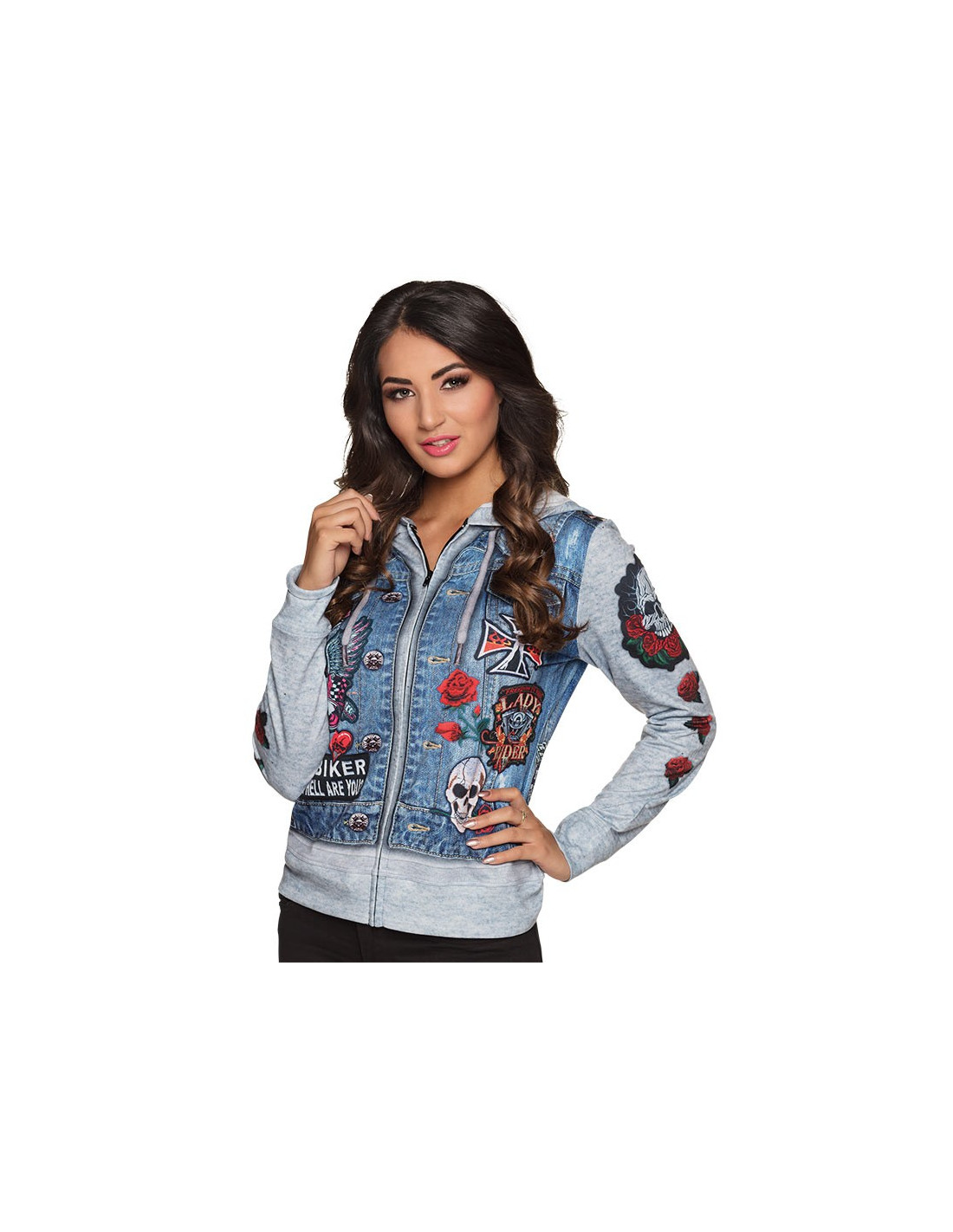 Esta chaqueta de motera muy realista que simula un chaleco vaquero con una chaqueta debajo y parches moteros por toda ella. Tiene una cremallera y una capucha.