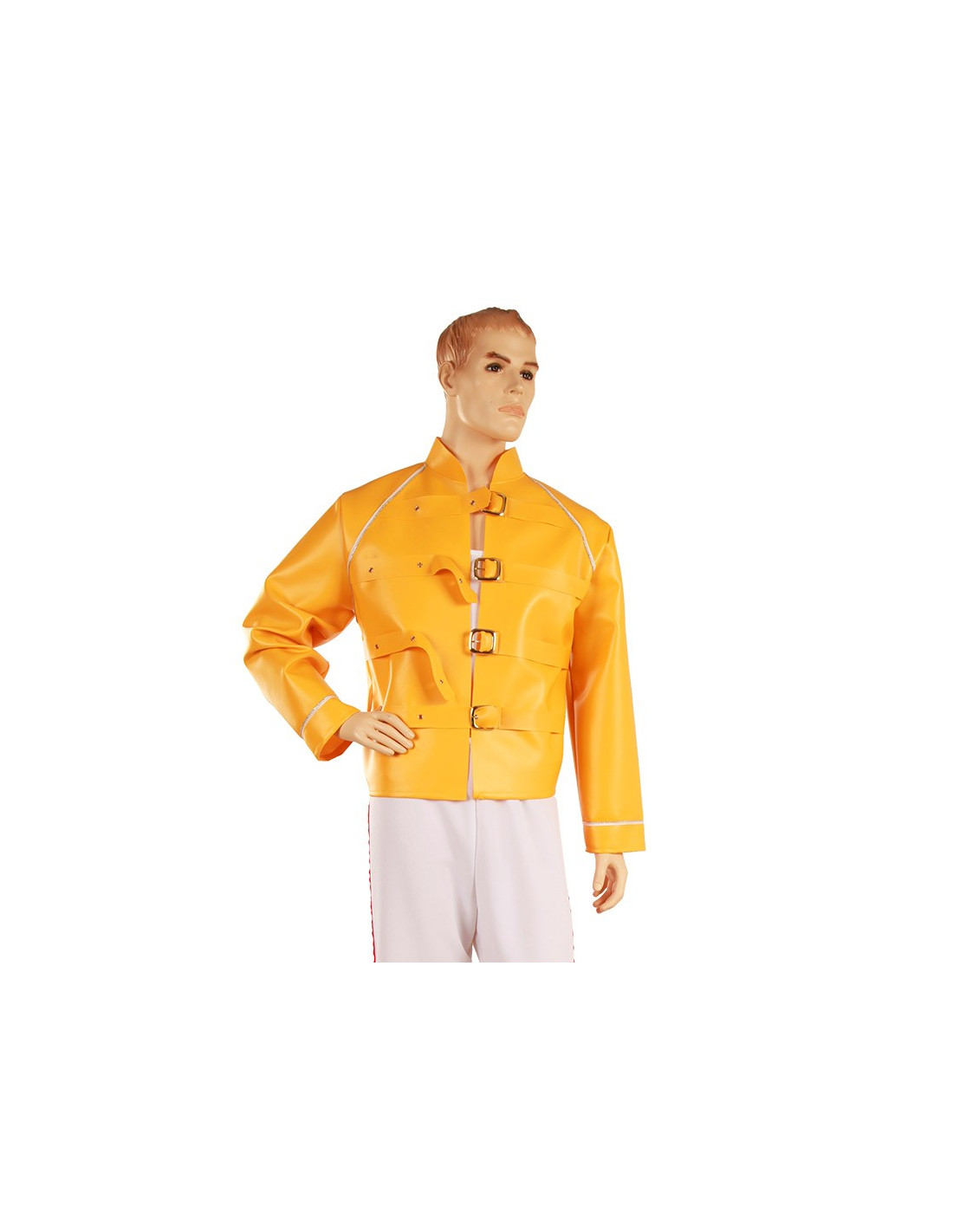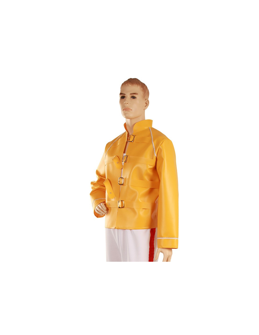 La chaqueta es de polipiel amarilla con hebillas metálicas doradas. No incluye pantalón.