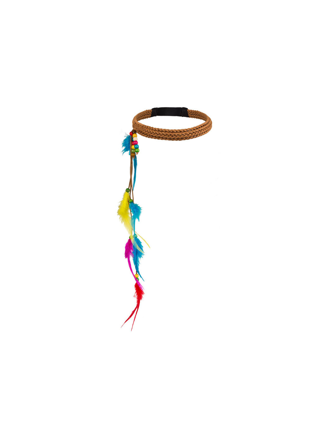 Contiene una cinta marrón trenzada con elástico en la parte posterior y unas plumas y abalorios de colores colgando de un lateral.