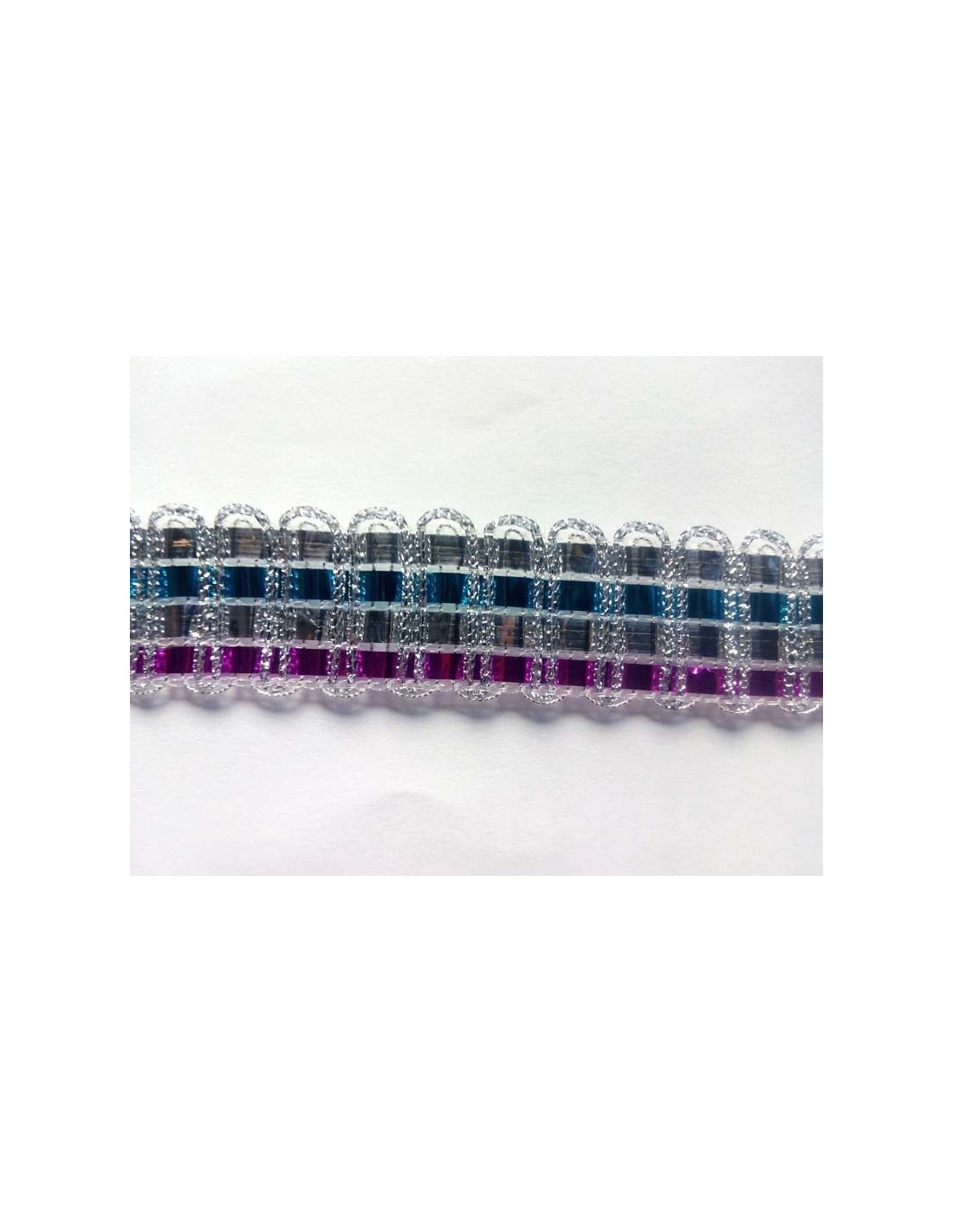 Cinta de 23mm de anchura decorada con cintas metalizadas en plata, turquesa y fucsia. Se vende por metros. Unidad mínima de venta 1m.