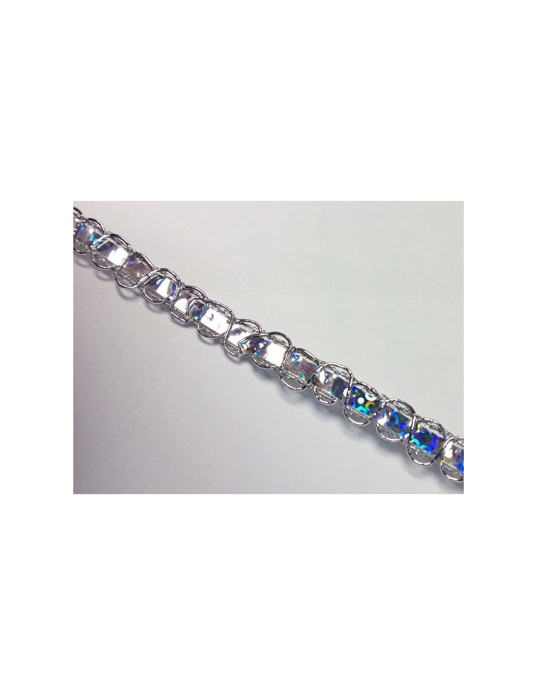 Cinta de tafetán de 3mm de anchura decorada con alambre plata. Anchura total 6mm. Se vende por metros. Unidad mínima de venta 1m.