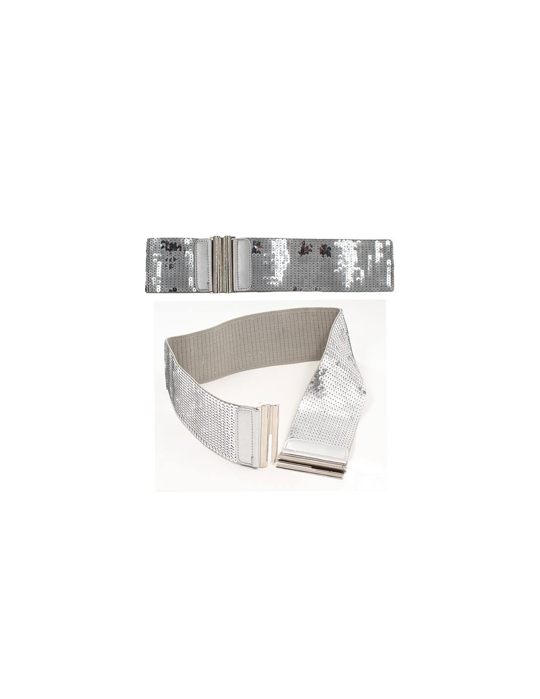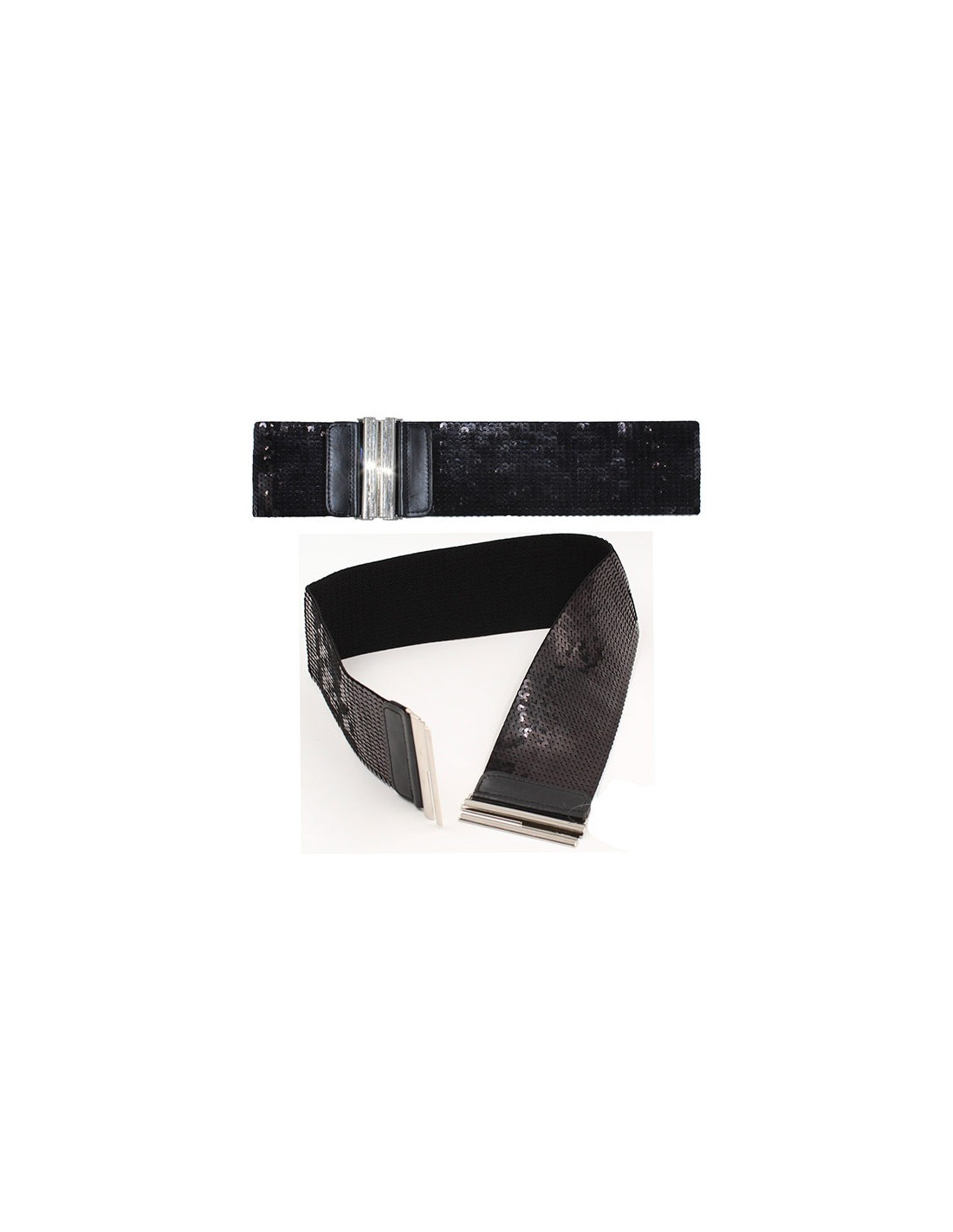 Cinturón lentejuelas cosidas con cierre metálico. Es elástico y mide 78cm de largo.