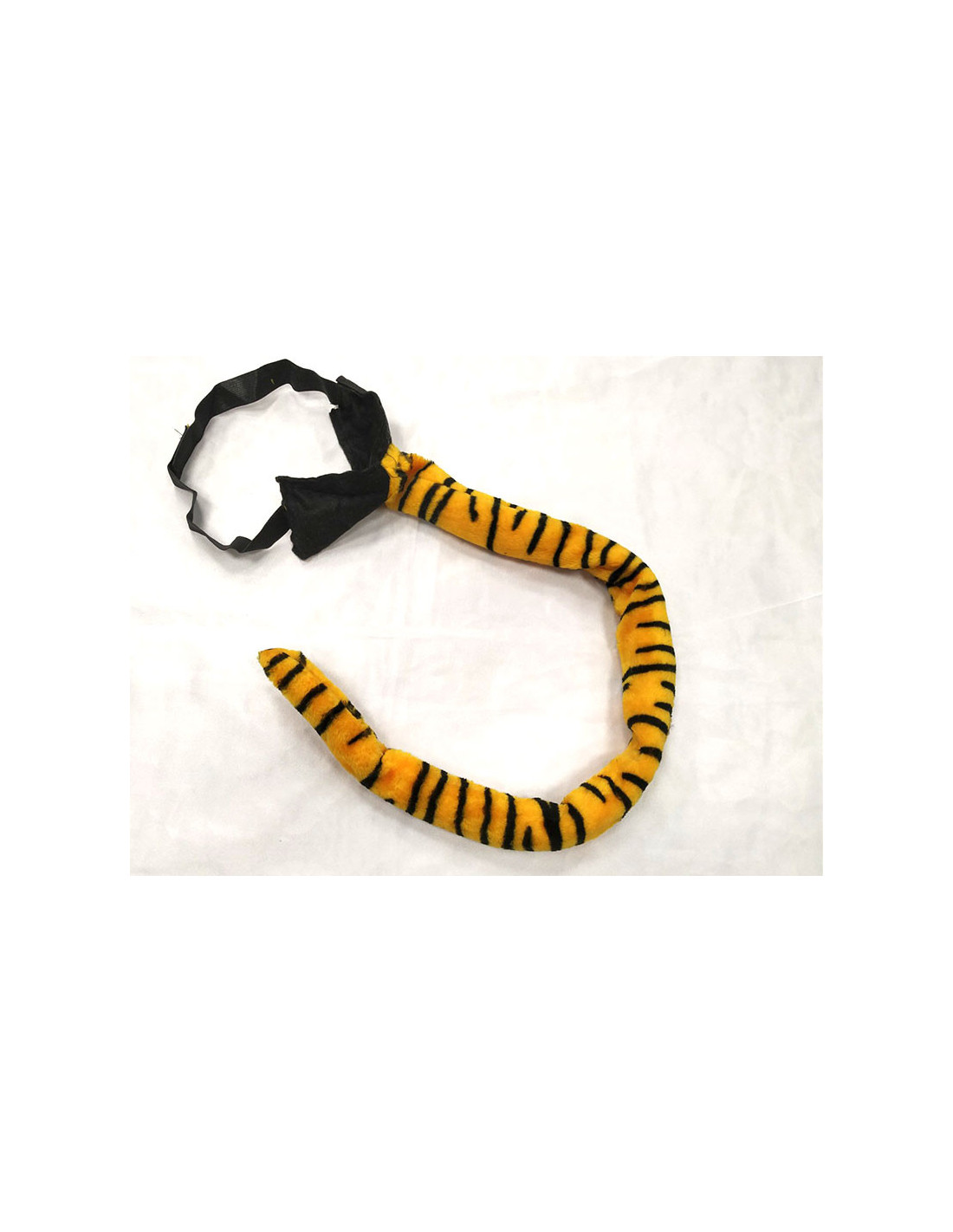Cola de animal tigre que mide 70cm de largo aproximadamente. Es de tela y se sujeta con goma y velcro en la cintura.