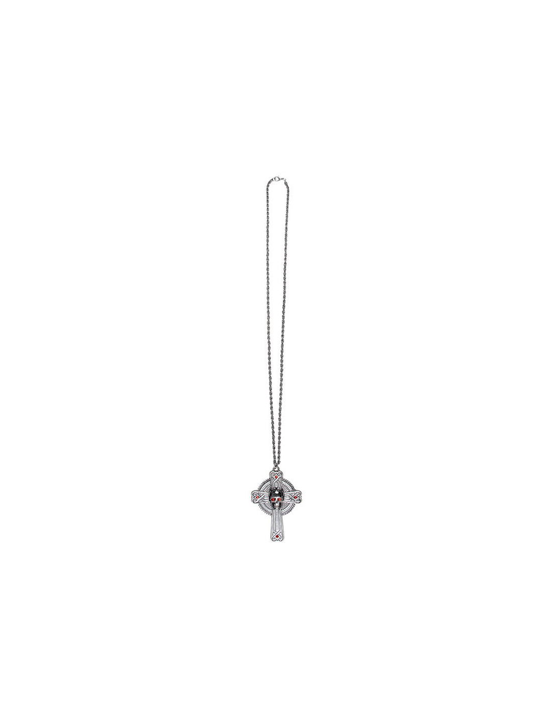 Consta de una cadena y una cruz metálica. La cruz mide 9x6cm y tiene unas piedras rojas incrustadas.